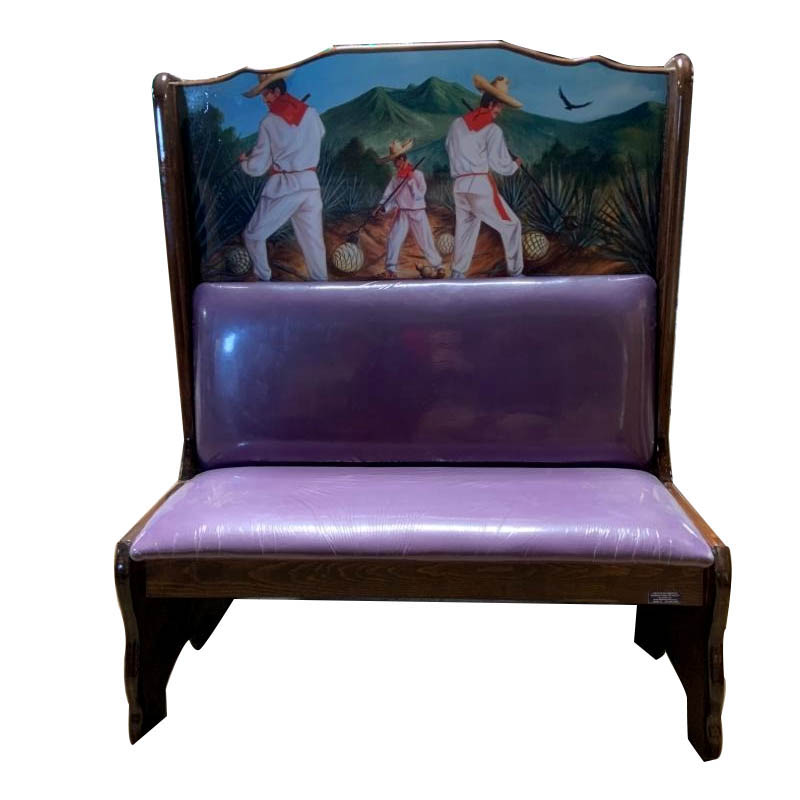 Booth con poster, hecho de madera color almendra, con poster de imagen de jimadores cortando agavez, lleva poster en la parte superior y por los lados del booth, tiene un vinil en el asiento y respaldo de color morado. Cada booth lleva doble refuerzo y el vinil es industrial, especialmente disenados para mayor durabilidad y resistencia al uso rudo del restaurante.