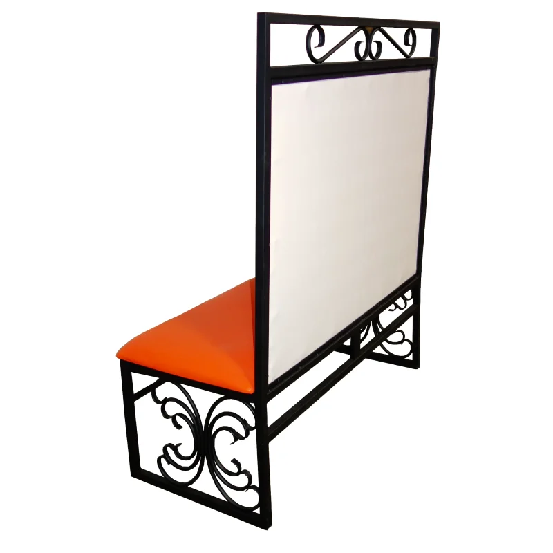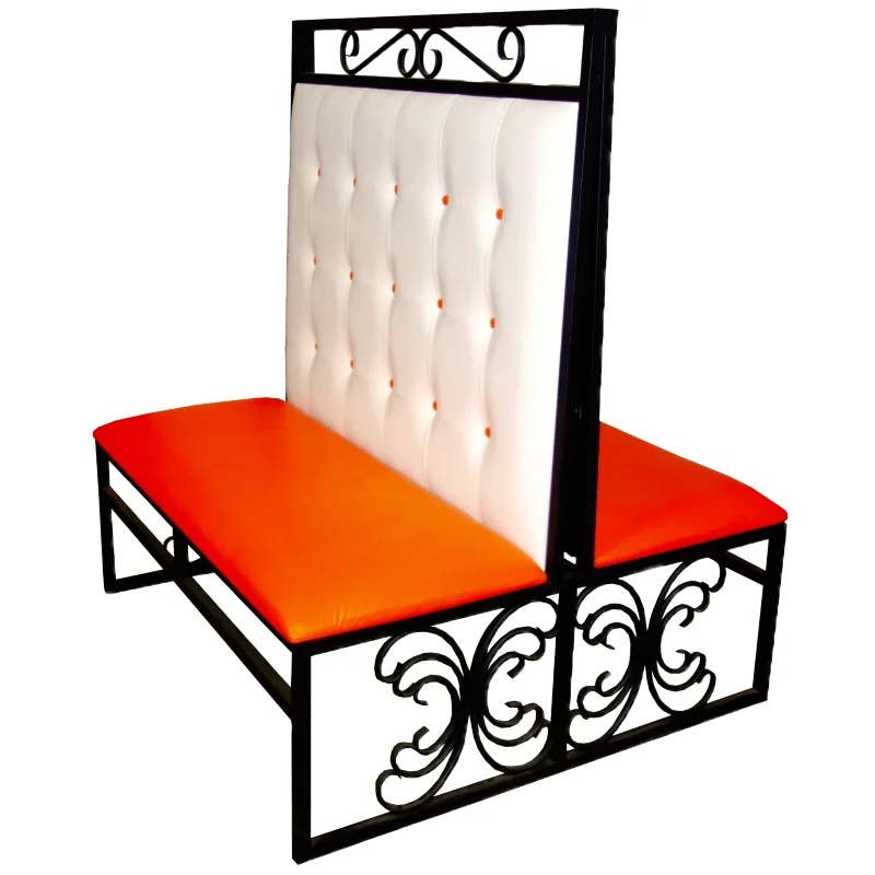 Booth base de metal con vinil naranja en el asiento y blanco en el respaldo. Vinil es industrial, especialmente disenados para mayor durabilidad y resistencia al uso rudo del restaurante.