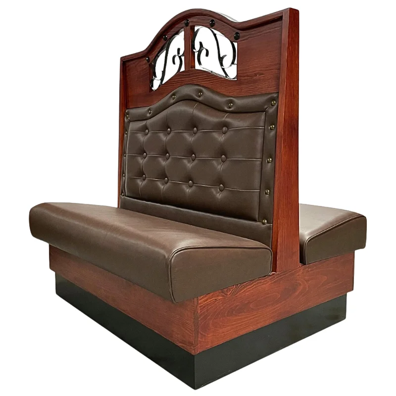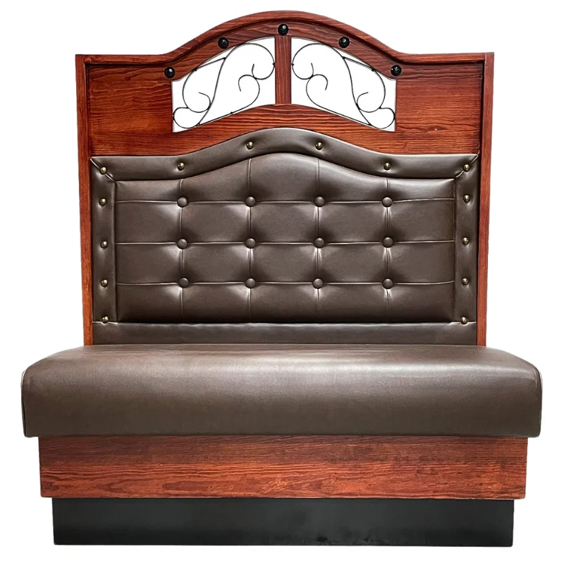 Booth con herreria incrustada en el respaldo y costados. Con vinil de alto rendimiento en asiento y respaldo. Llevan doble refuerzo y el vinil es industrial, especialmente disenados para mayor durabilidad y resistencia al uso rudo del restaurante.