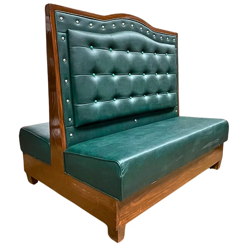Booth con diseno de madera color almendra, hecho a mano, con vinil abotonado en el asiento y respaldo de color verde con tachuelas cromadas. Llevan doble refuerzo y el vinil es industrial, especialmente disenados para mayor durabilidad y resistencia al uso rudo del restaurante.