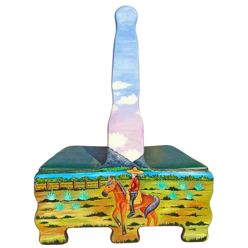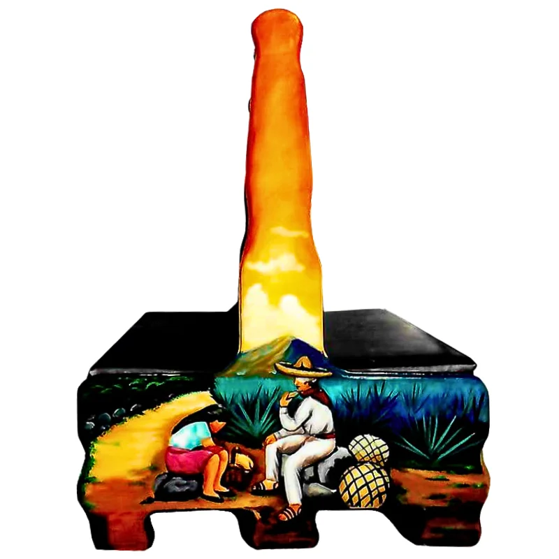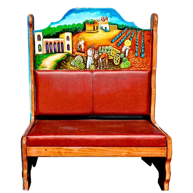 Booth de madera color almendra, el respaldo es una pintura hecha a mano por artesanos mexicanos, imagenes pintadas de mismo estilo que el respaldo por los laterales, tiene vinyl industrial en el restaldo y el asiento en color  de su preferencia. Todas las imagenes son pintadas a mano cuidadosame en la parte superior del booth. Estan cibuertos con barniz para mayor proteccion de la obra.  Cada mueble lleva doble refuerzo especialmente disenados para mayor durabilidad y resistencia al uso rudo del restaurante.
