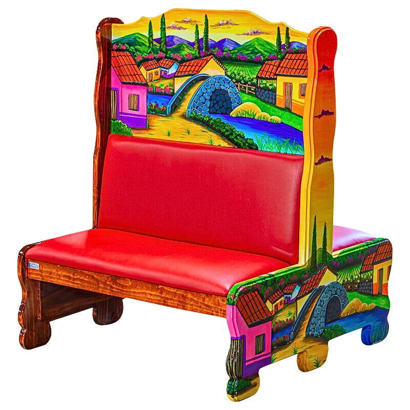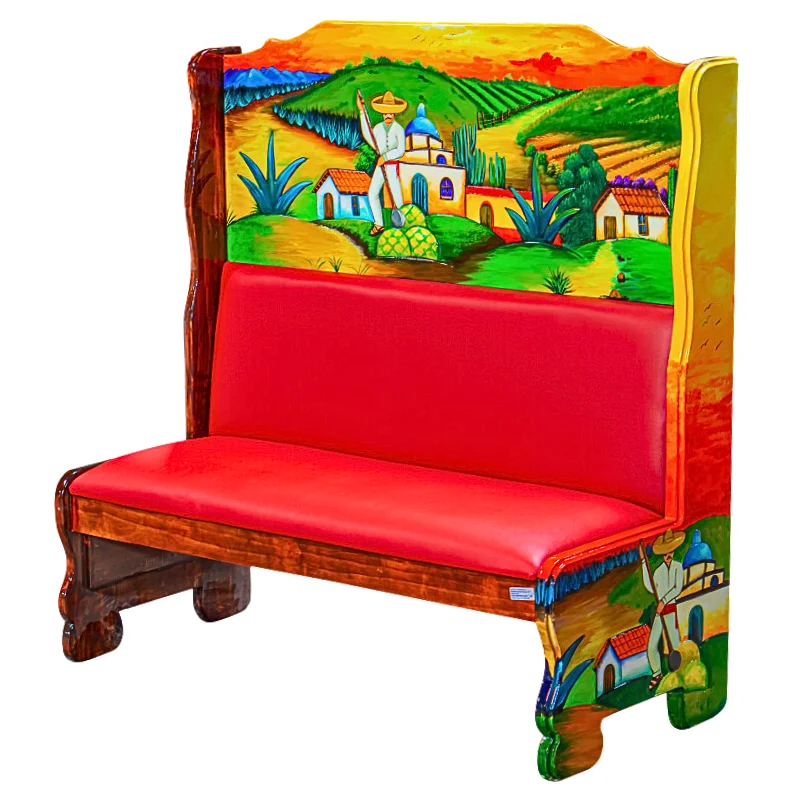 Booth de madera color almendra, el respaldo es una pintura hecha a mano por artesanos mexicanos, imagenes pintadas de mismo estilo que el respaldo por los laterales, tiene vinyl industrial en el restaldo y el asiento en color  de su preferencia. Todas las imagenes son pintadas a mano cuidadosame en la parte superior del booth. Estan cibuertos con barniz para mayor proteccion de la obra.  Cada mueble lleva doble refuerzo especialmente disenados para mayor durabilidad y resistencia al uso rudo del restaurante.