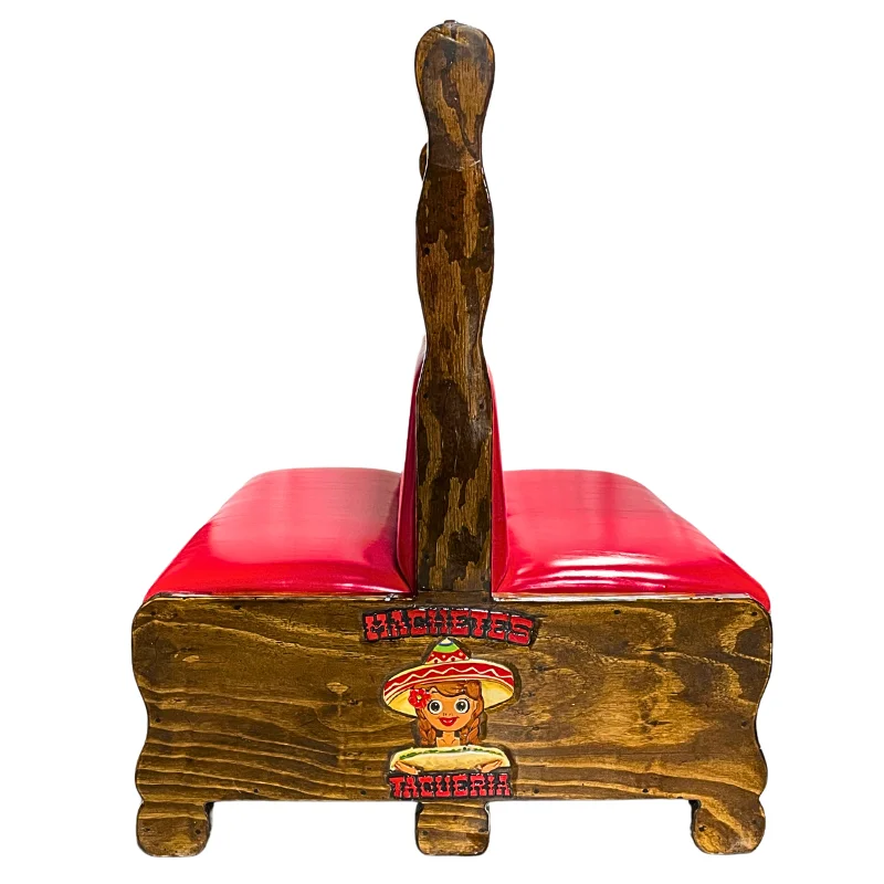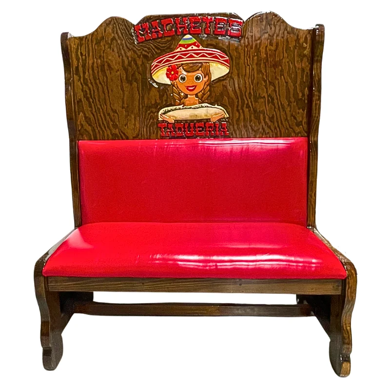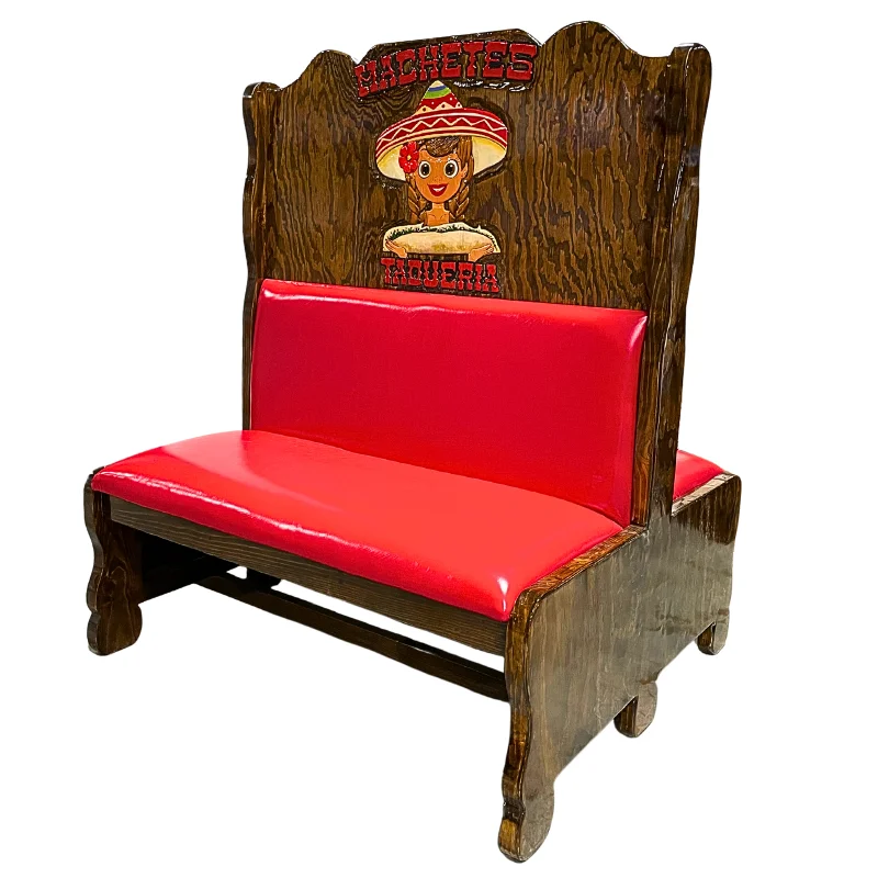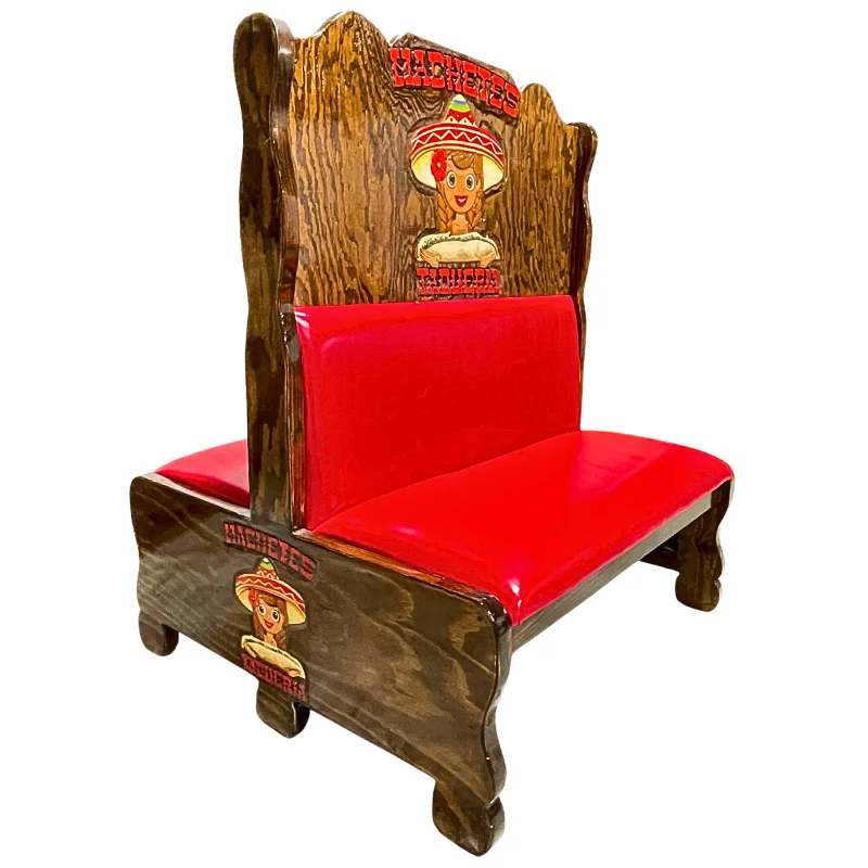 Booth rustico de madera color almendra oscuro, hecho a mano con gravado el nombre y logotipo del restaurante pintado a mano, vinil en el asiento y respaldo, llevan doble refuerzo y el vinil es industrial, especialmente disenados para mayor durabilidad y resistencia al uso rudo del restaurante.