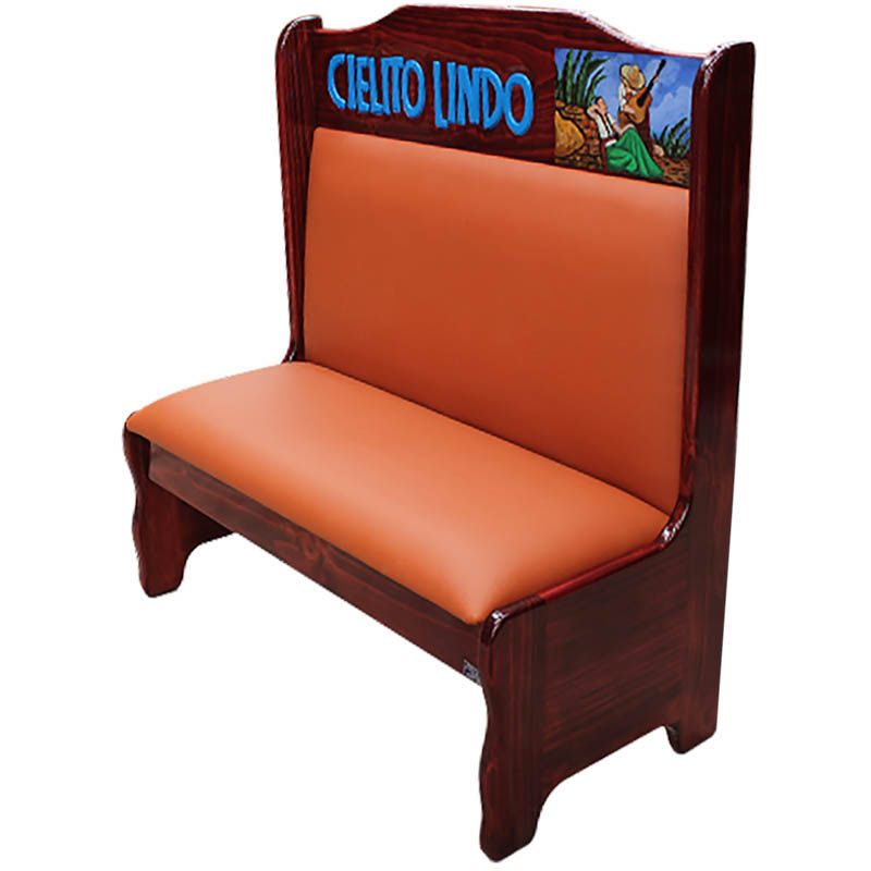 Booth rustico de madera color almendra oscuro, hecho a mano con gravado y pintado a mano el nombre y logotipo del restaurante con grabados en a los lados del booth, vinil en el asiento y respaldo de color naranja. llevan doble refuerzo y el vinil es industrial, especialmente disenados para mayor durabilidad y resistencia al uso rudo del restaurante.