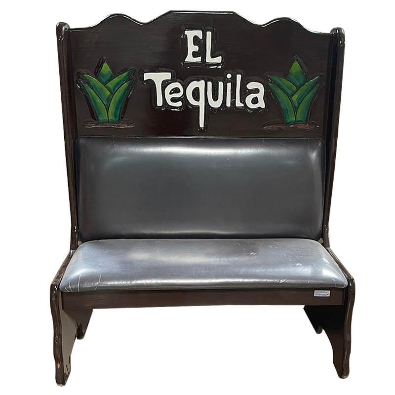 Booth de madera color chocolate, grabado nombre de restautante, gravado y pintados  agaves a  los costados.