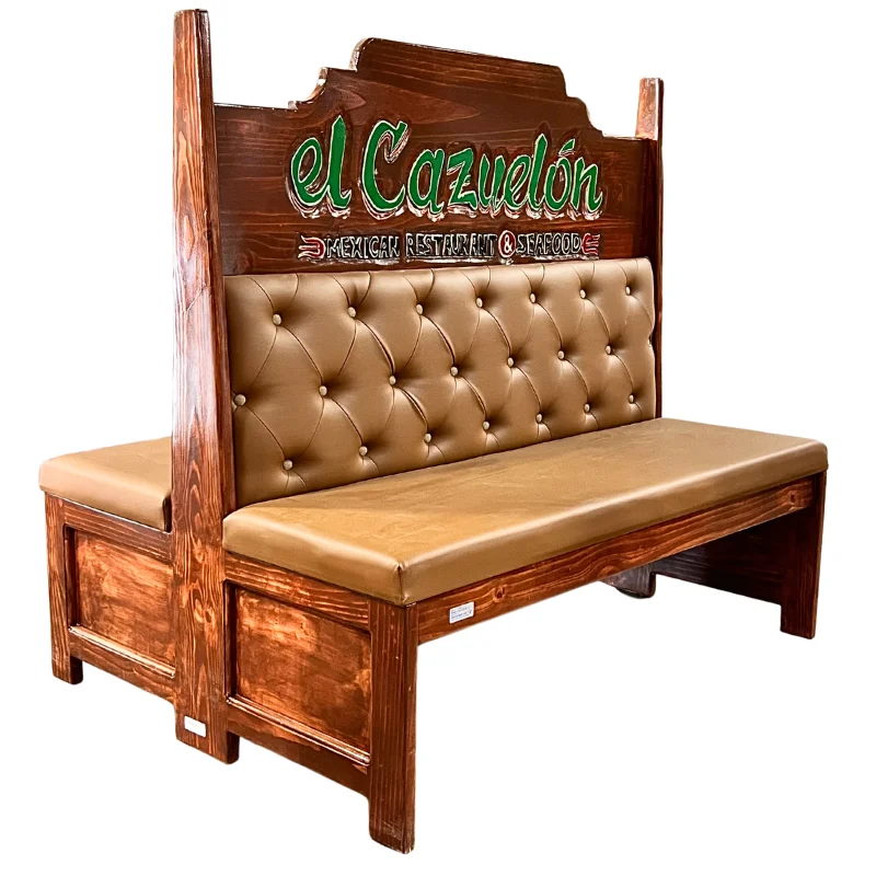 Booth rustico de madera color almendra oscuro, hecho a mano con gravado y pintado a mano el nombre y logotipo del restaurante con grabados en a los lados del booth, vinil en el asiento y respaldo. Llevan doble refuerzo y el vinil es industrial, especialmente disenados para mayor durabilidad y resistencia al uso rudo del restaurante.
