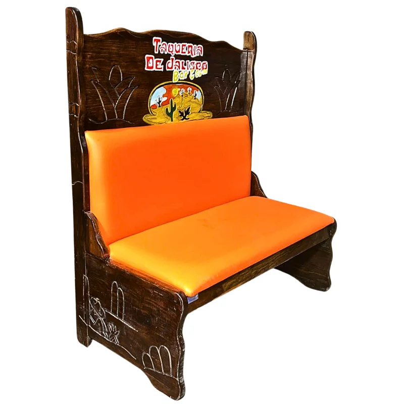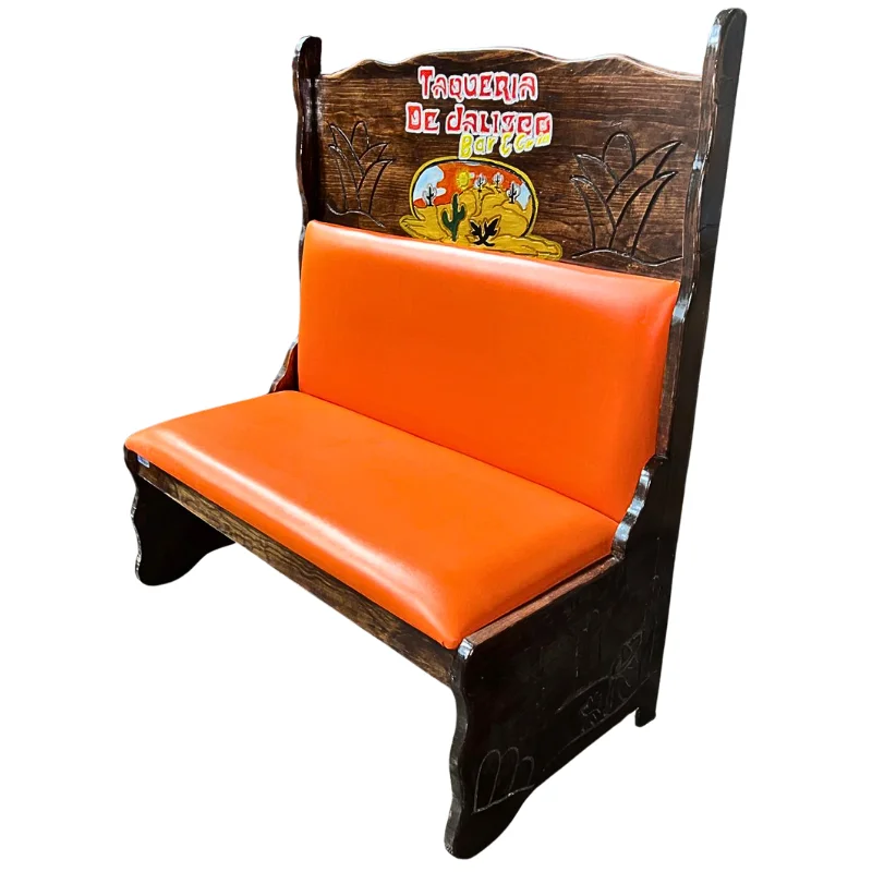 Booth rustico de madera color almendra, hecho a mano gravado el nombre y logotipo del restaurant, llevan doble refuerzo y el vinil es industrial, especialmente disenados para mayor durabilidad y resistencia al uso rudo del restaurante.