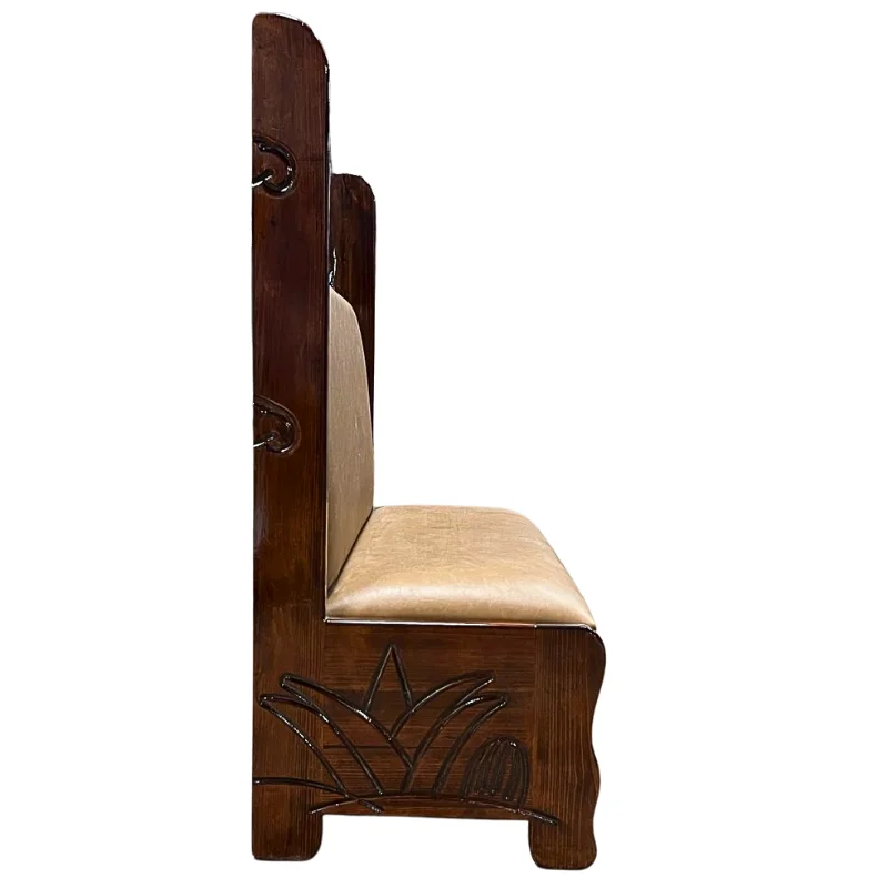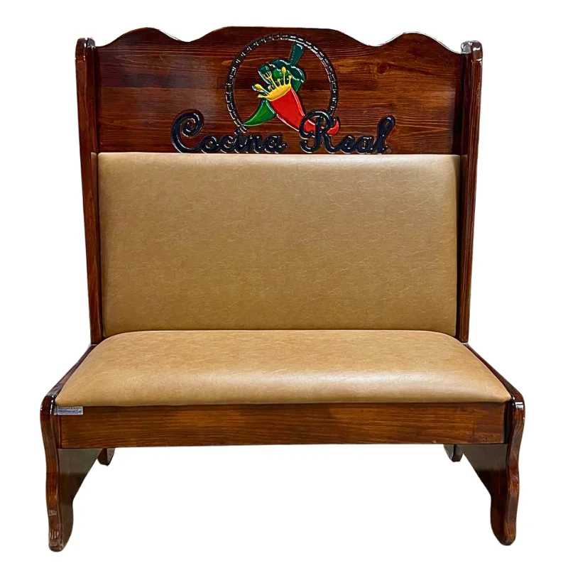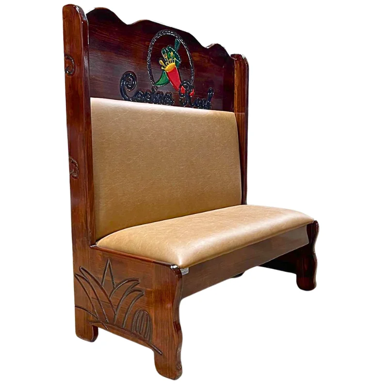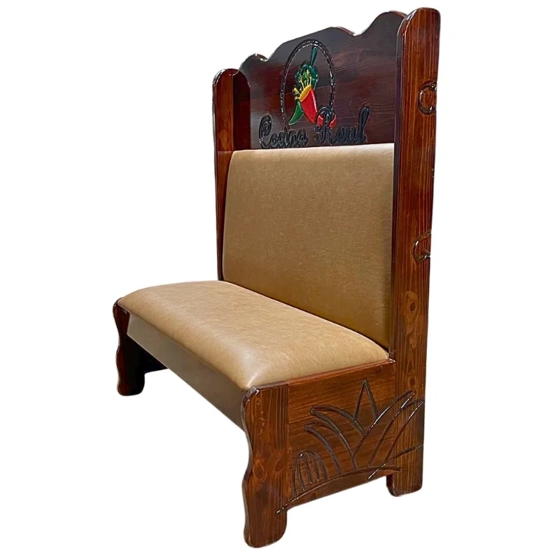 Booth rustico de madera color almendra oscuro, hecho a mano con gravado y pintados a mano del nombre y logotipo del restaurante con grabados en a los lados del booth, vinil en el asiento y respaldo de color beige. llevan doble refuerzo y el vinil es industrial, especialmente disenados para mayor durabilidad y resistencia al uso rudo del restaurante.