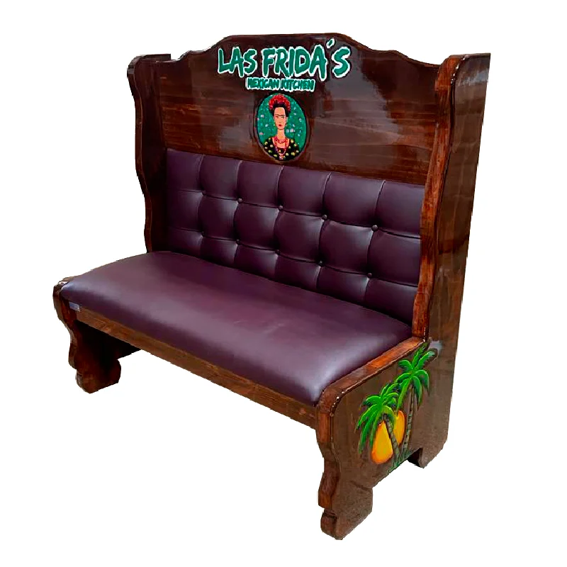 Booth rustico de madera color almendra, hecho a mano gravado el nombre y logotipo del restaurant, llevan doble refuerzo y el vinil es industrial, especialmente disenados para mayor durabilidad y resistencia al uso rudo del restaurante.
