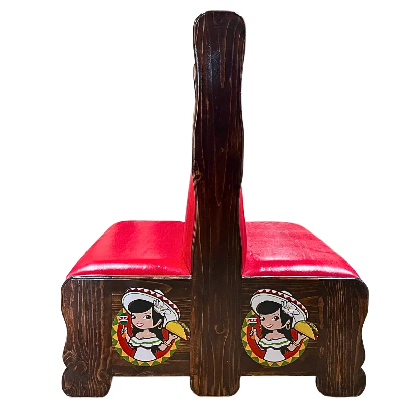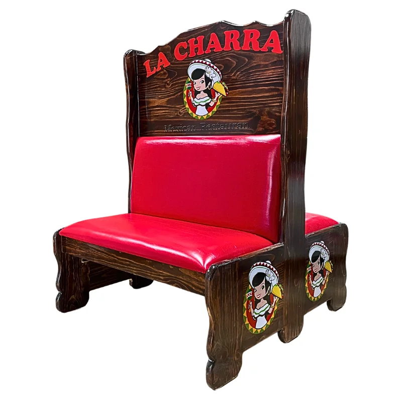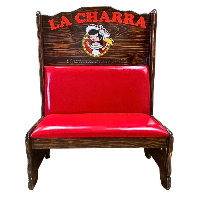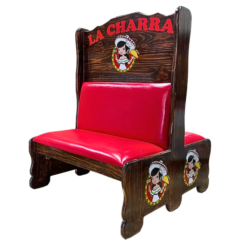 Booth rustico de madera color almendra oscuro, hecho a mano con gravado el nombre y logotipo del restaurante pintado a mano, vinil en el asiento y respaldo de color rojo. llevan doble refuerzo y el vinil es industrial, especialmente disenados para mayor durabilidad y resistencia al uso rudo del restaurante.