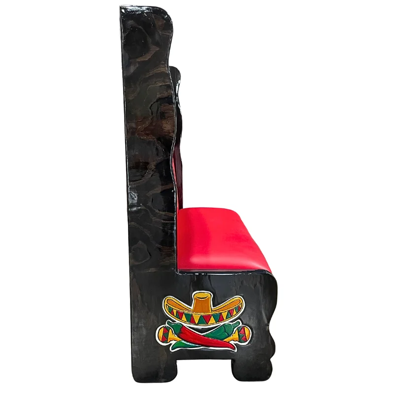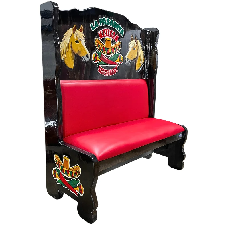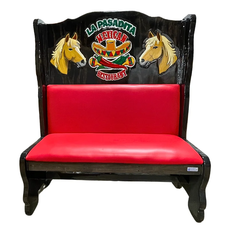 Booth rustico de madera color almendra oscuro, hecho a mano con gravado y pintado a mano el nombre y logotipo del restaurante con grabados en a los lados del booth, vinil en el asiento y respaldo. Llevan doble refuerzo y el vinil es industrial, especialmente disenados para mayor durabilidad y resistencia al uso rudo del restaurante.
