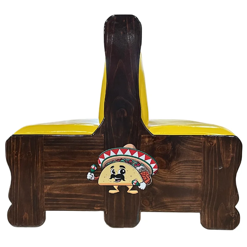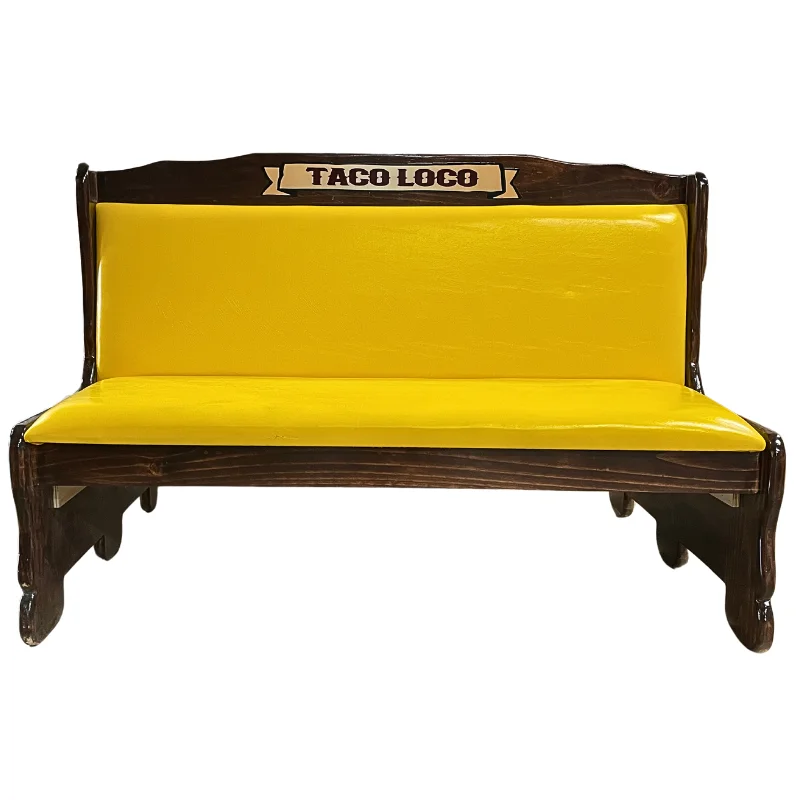 Booth rustico de madera color almendra oscuro, hecho a mano con gravado y pintado a mano el nombre y logotipo del restaurante con grabados en a los lados del booth, vinil en el asiento y respaldo. Llevan doble refuerzo y el vinil es industrial, especialmente disenados para mayor durabilidad y resistencia al uso rudo del restaurante.