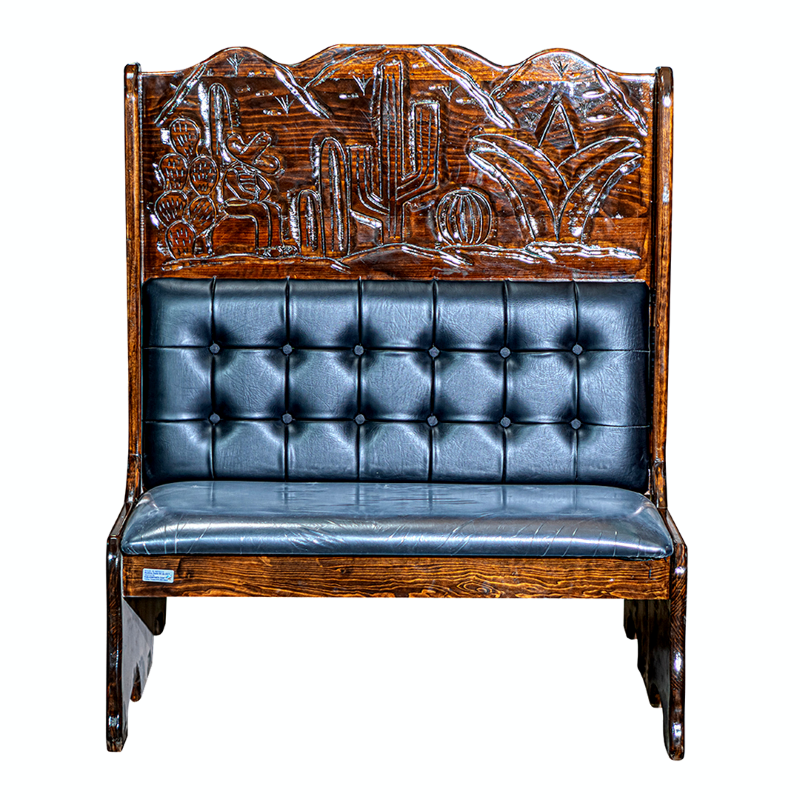Booth rustico de madera color almendra oscuro, hecho a mano con gravado del nombre y logotipo del restaurante con grabados en a los lados del booth, vinil en el asiento y respaldo de color gris. llevan doble refuerzo y el vinil es industrial, especialmente disenados para mayor durabilidad y resistencia al uso rudo del restaurante.