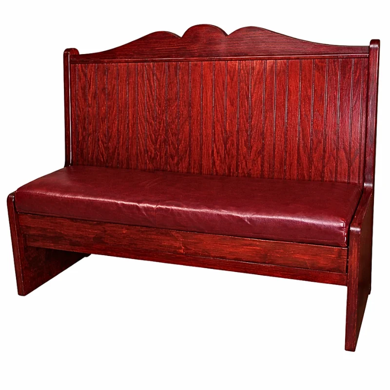 Booth rustico de madera color rojizo, hecho a mano con gravado del nombre y logotipo del restaurante con grabados en a los lados del booth, vinil en el asiento color guindo. llevan doble refuerzo y el vinil es industrial, especialmente disenados para mayor durabilidad y resistencia al uso rudo del restaurante.