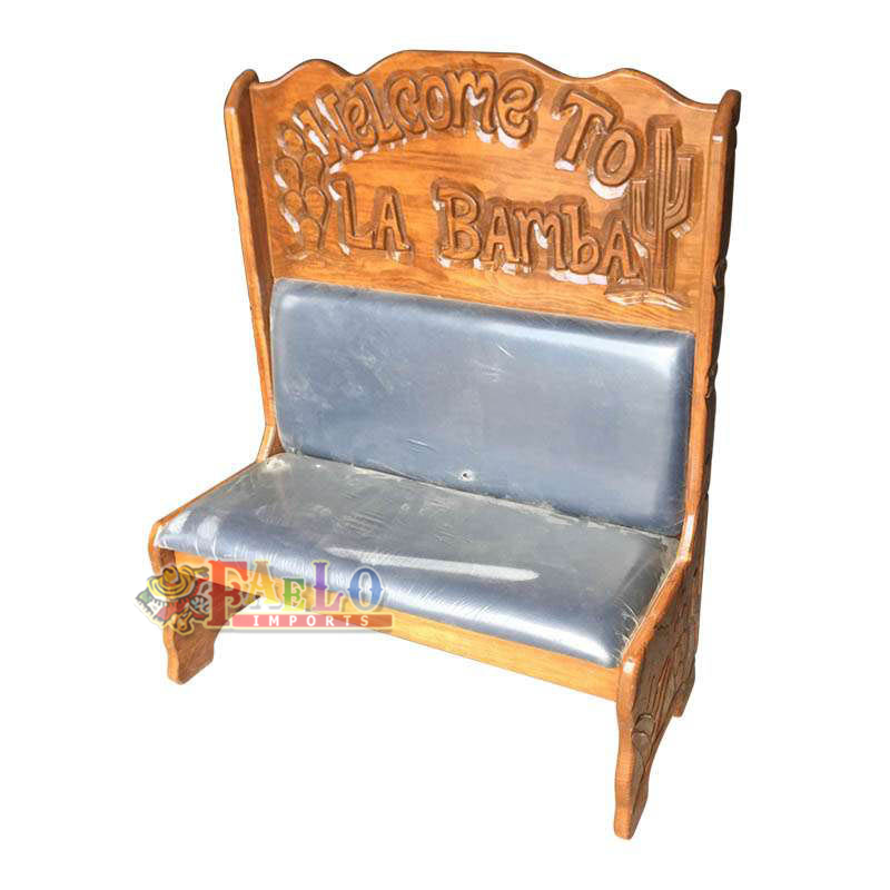 Booth rustico de madera color almendra, hecho a mano con el logo del restaurante, acompanado de cactus gravados, vinil en el asiento y respaldo de color negro. llevan doble refuerzo y el vinil es industrial, especialmente disenados para mayor durabilidad y resistencia al uso rudo del restaurante.