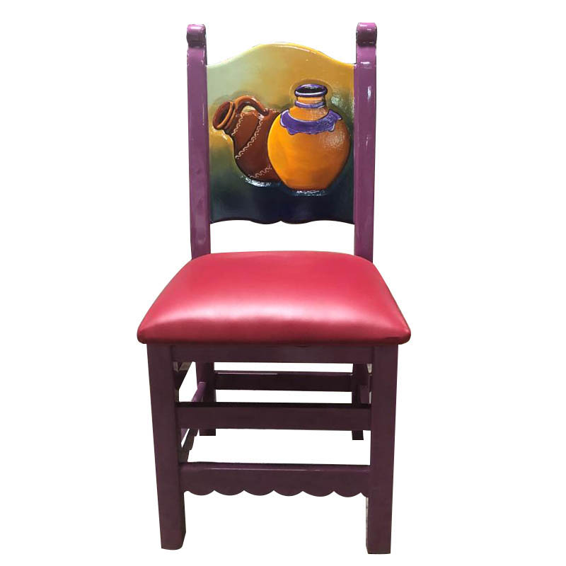 Silla de madera tallada artisticamente, respaldo tallado y pintado a mano imagen de cantaros.