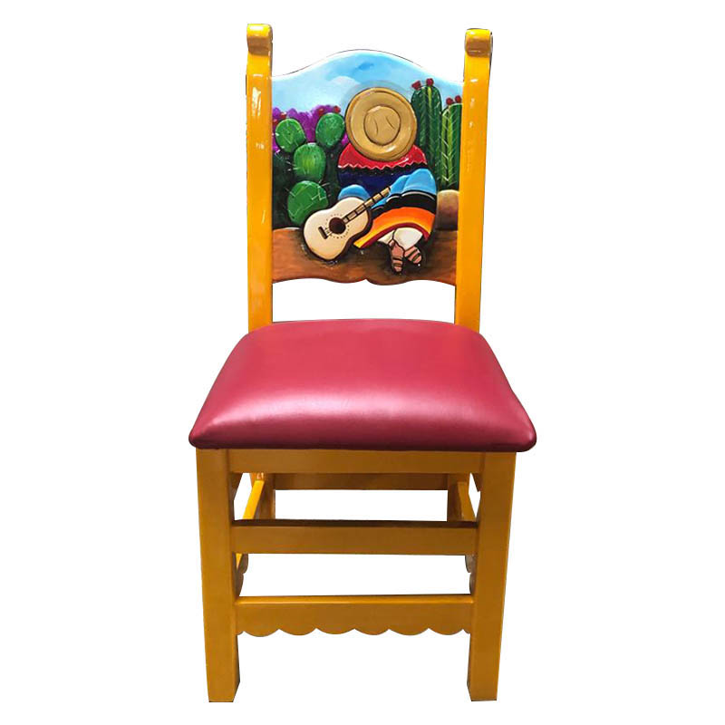 Ofrecemos una amplia variedad de diseños entre los cuales puede elegir. Sillas artesanales con imágenes en el respaldo, según el tema de interés, talladas y pintadas a mano por artesanos mexicanos. Si lo desea, podemos personalizar las sillas con el nombre de su restaurante. Además, ofrecemos diversas opciones de tonos para elegir, tanto en el color de la madera como en el del vinil, o incluso sin vinil.