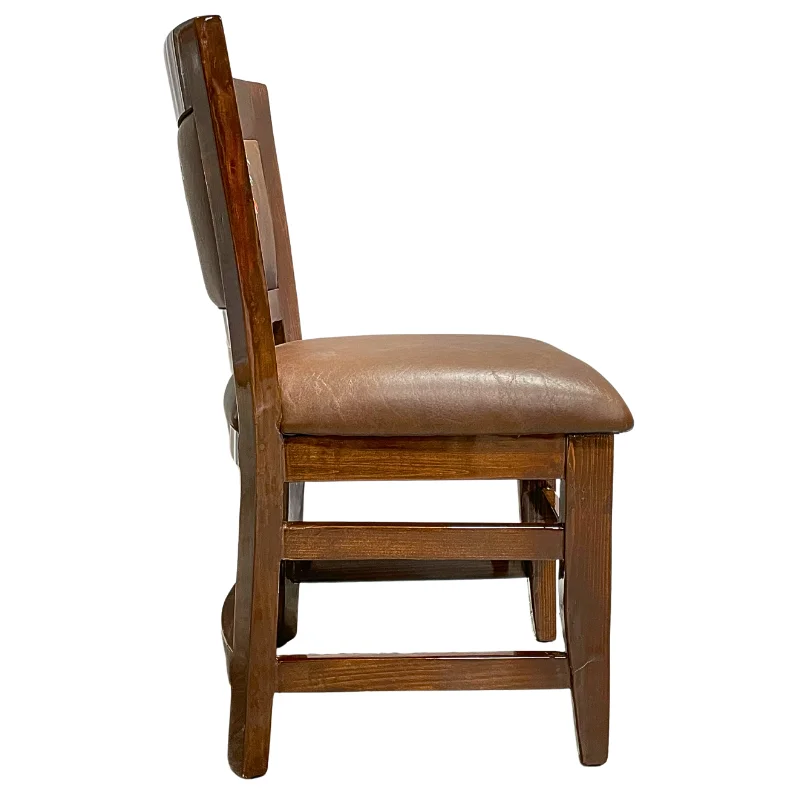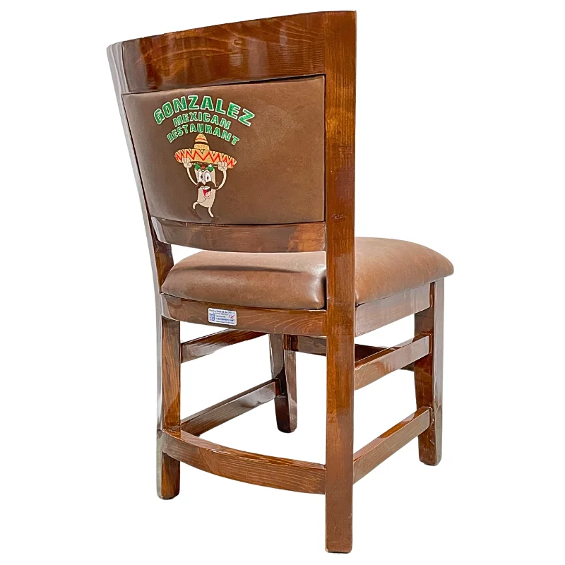 Silla de madera hecha a mano. El respaldo puede escoger de entre una gran variedad de temas, o bien con el nombre y logotipo de su restaurante, al igual existen diferentes tonos a escoger tanto en el color de madera, como el vinil, o si lo prefiere sin vinil.
