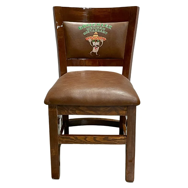 Silla con diseno bordado en el respaldo el logo y nombre del restaurant y vinil color cafe. estructura de madera color almendra.