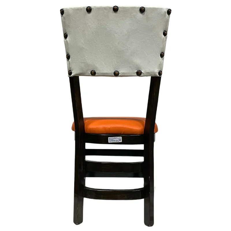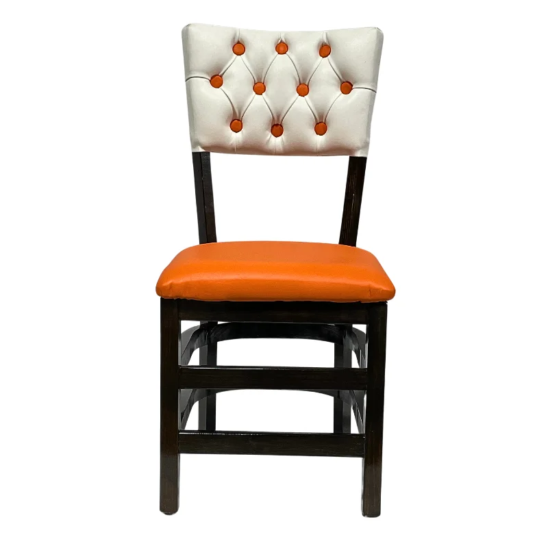 Silla de madera color choco, con vinil color blanco con botones en el  respaldo y asiento de vinil naranja.