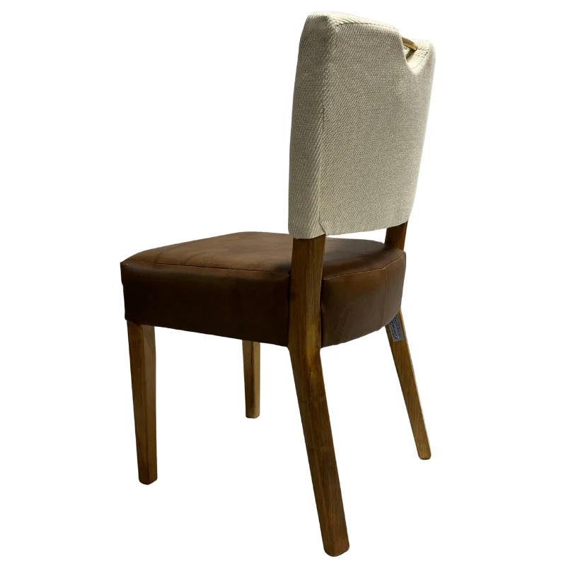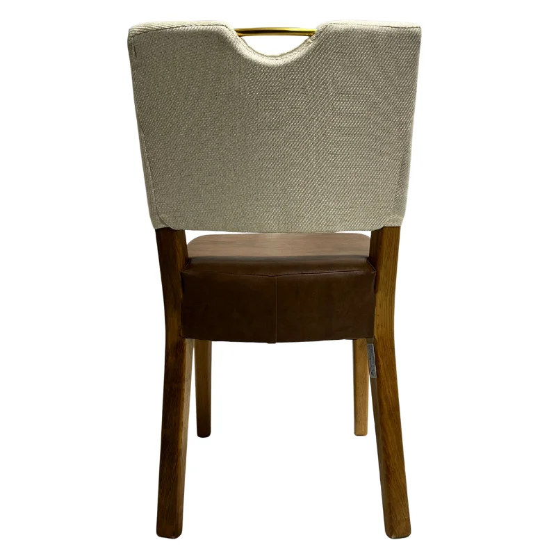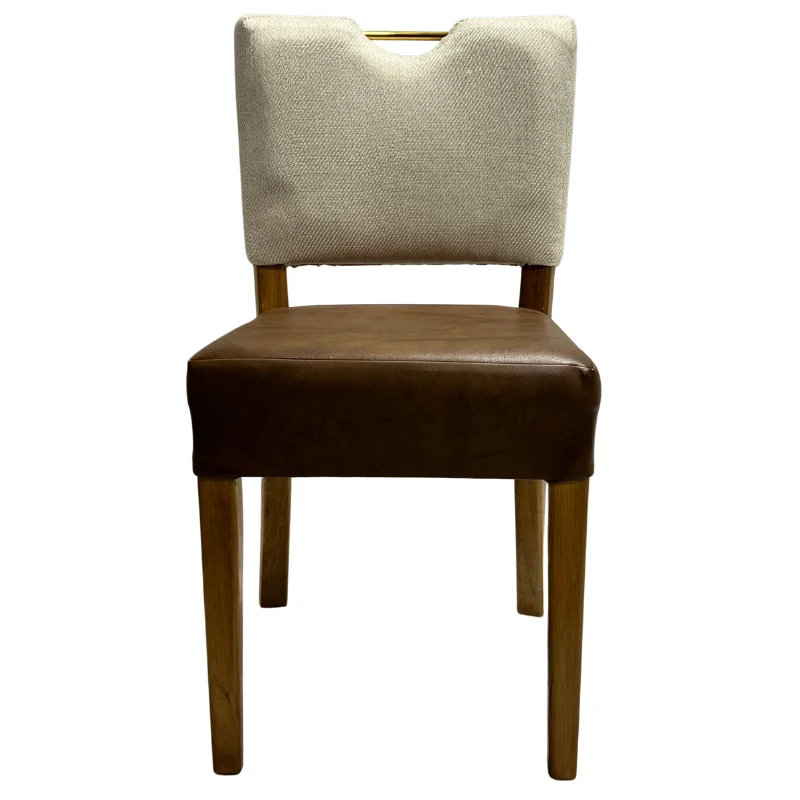 Esta elegante silla fabricada a mano en madera color almendra, cuenta con un respaldo tapizado en tela color beige con un accesorio dorado mate de 6" diseñada con un estilo moderno y un asiento de vinil color café claro.