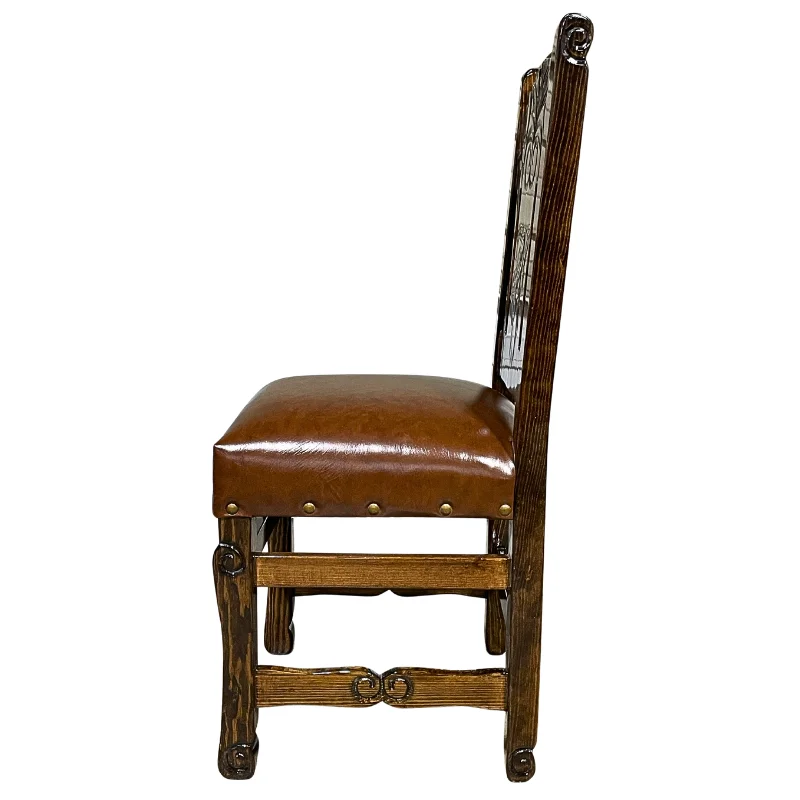 Silla de madera color almendra oscuro con diseño labrado a mano  con tachuelas al rededor del asiento.