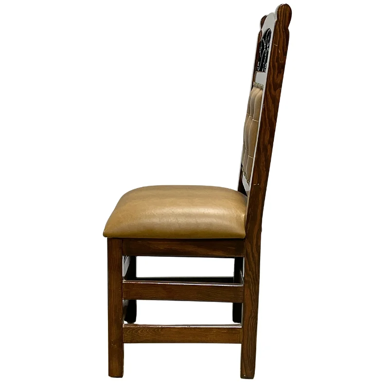 Silla de madera hecha a mano. El respaldo puede escoger de entre una gran variedad de temas, o bien con el nombre y logotipo de su restaurante, al igual existen diferentes tonos a escoger tanto en el color de madera, como el vinil, o si lo prefiere sin vinil.