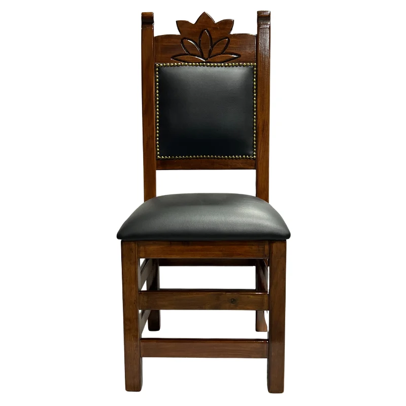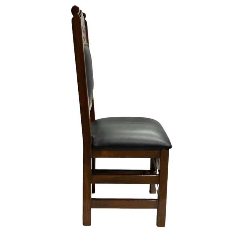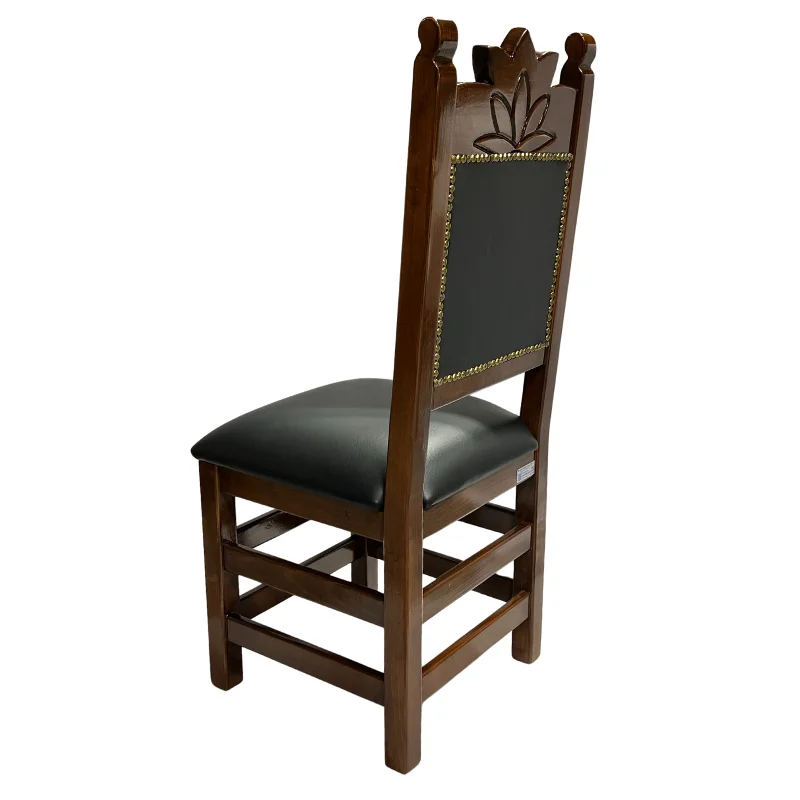 Silla con diseno labrado a mano de madera color almendra oscuro, el respaldo vinyl negro que le dan un aspecto tradicional y elegante, con vinil en el asiento color negro.