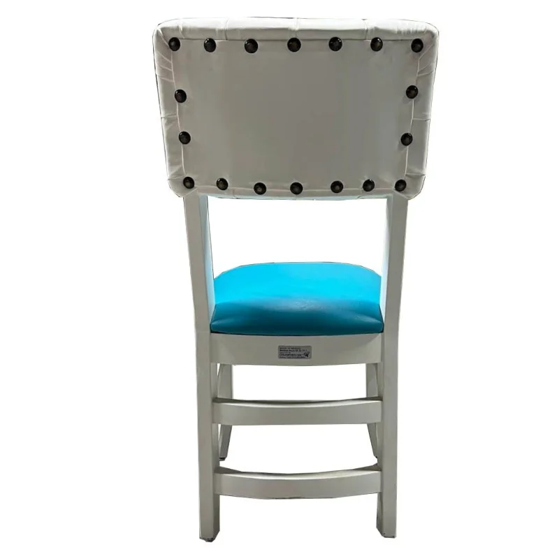 Silla de madera color blanco, con vinil color blanco con botones en el  respaldo y asiento de vinil turqueza.