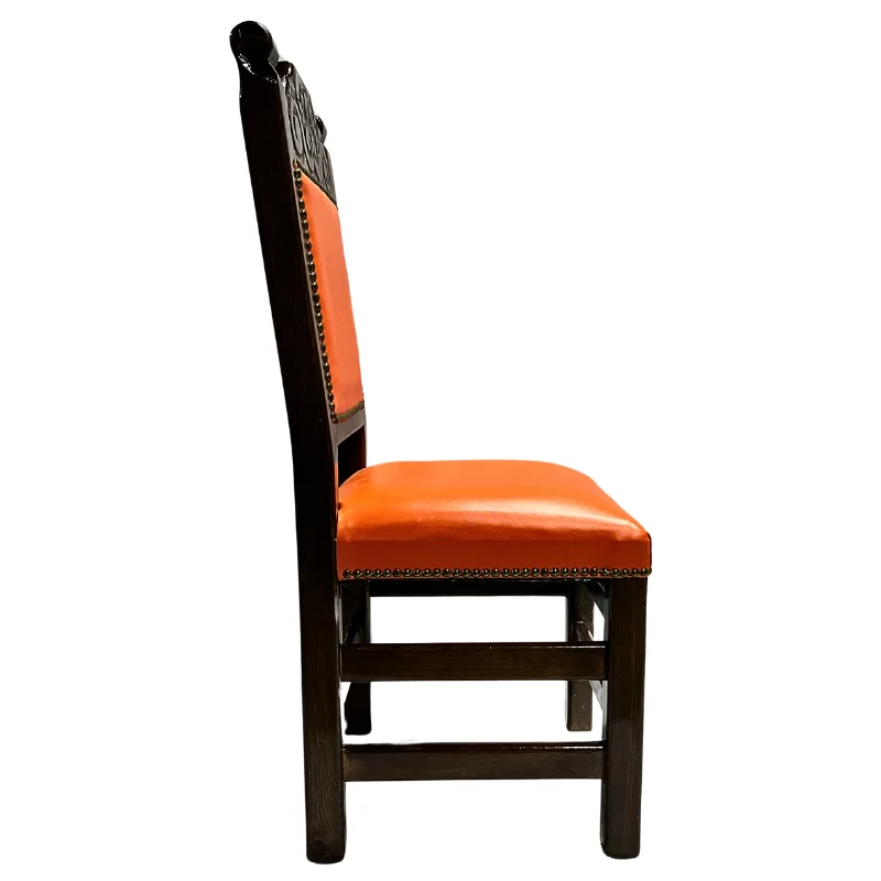 Silla de madara color choco con diseno con diseno labrado a mano y vinil color naranja con tachuelas alrededor, las tachuelas pueden ser de color plateado, dorado, bonce y cobre, segun la eleccion.