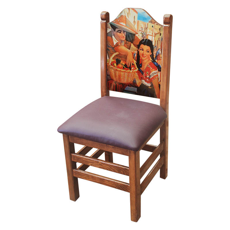 Silla con poster con imagen de una mujer sosteniendo una canasta y un hombre vestido de charro en el pueblo, el poster va en ambos lados del respaldo, Madera color almendra y vinyl cafe.