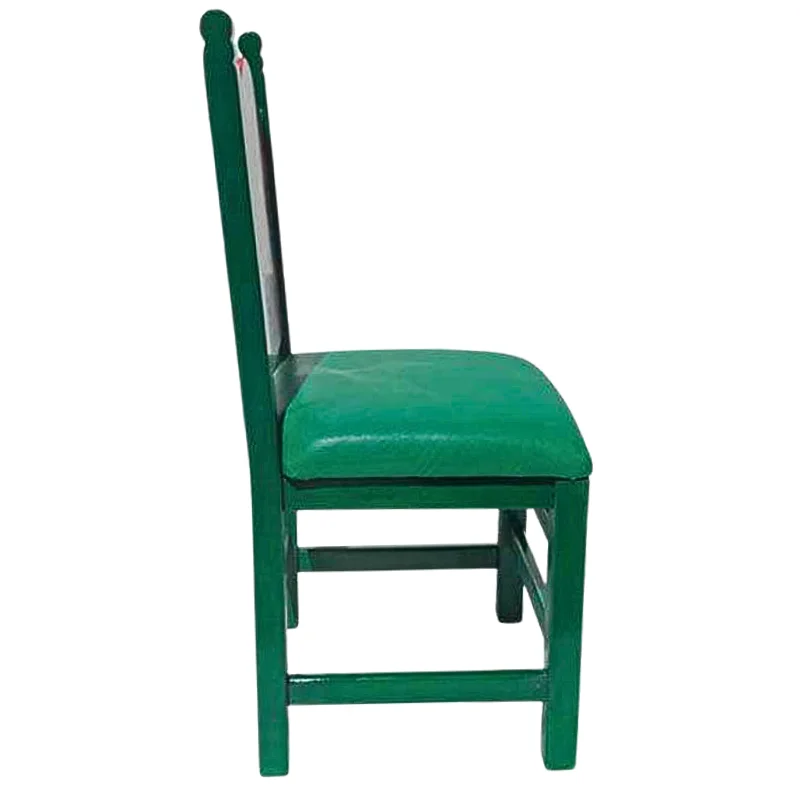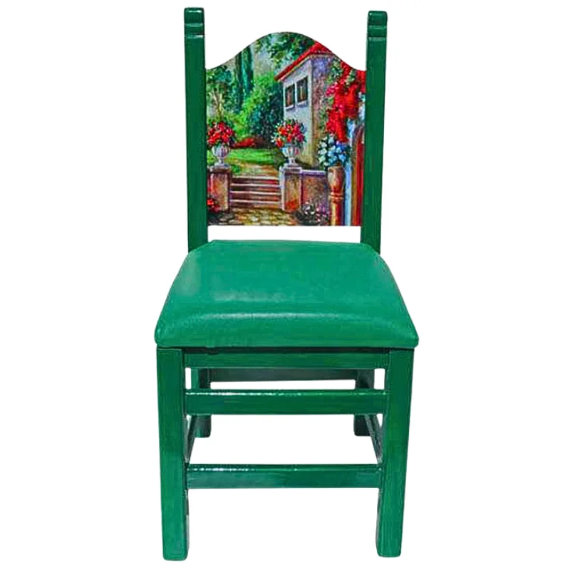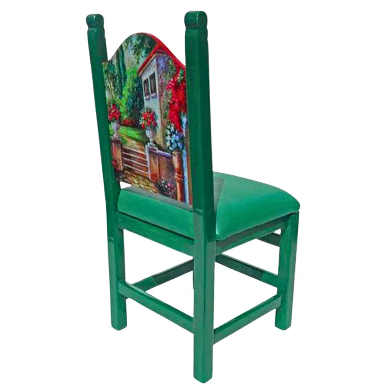 Silla de madera en tono verde, con respaldo que presenta un póster de una casa rodeada de flores y árboles. Tiene asiento de vinilo verde.