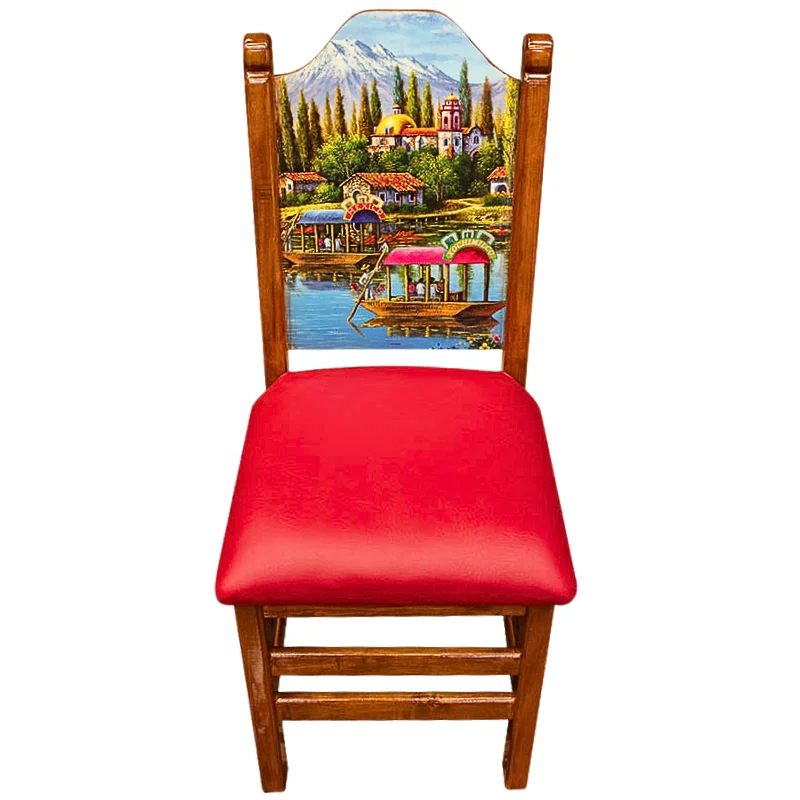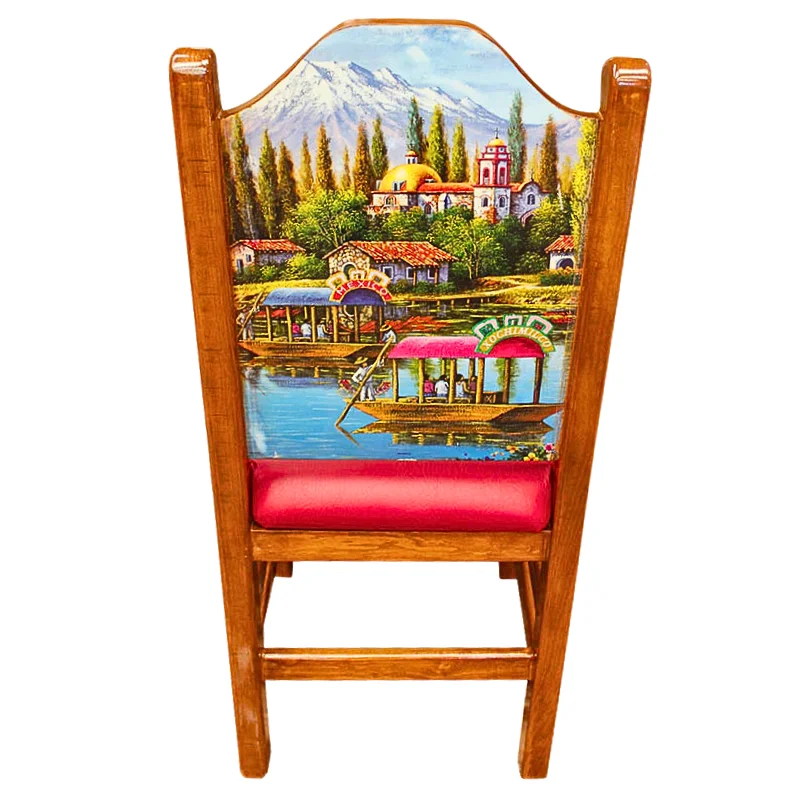 Silla de madera en tono almendra con respaldo decorado con una imagen de una canoa en un lago, y asiento tapizado en vinilo rojo.