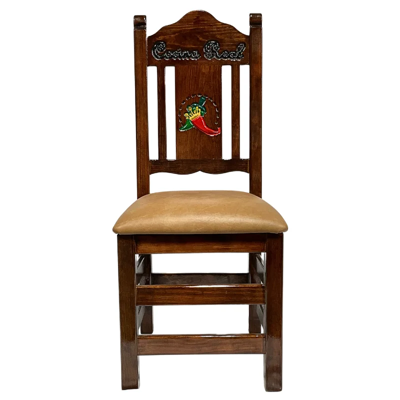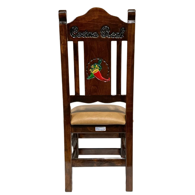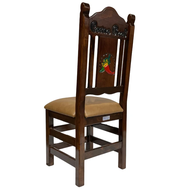 Ofrecemos una amplia variedad de diseños entre los cuales puede elegir. Realizamos grabados de imágenes según el tema de interés en el respaldo de la silla, los cuales pueden ser tallados y pintados a mano por artesanos mexicanos. Si lo desea, podemos personalizar las sillas con el nombre de su restaurante. Además, ofrecemos diversas opciones de tonos para elegir, tanto en el color de la madera como en el del vinilo, o incluso sin vinil.
