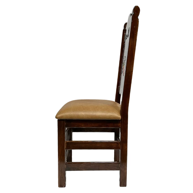 Silla rustisca de madera color almendra, con logotipo en el centro, labrado y pintado a mano por ambos lados de agave y vinil color beige.