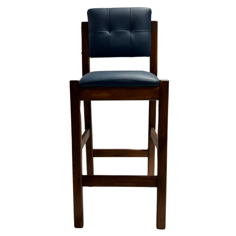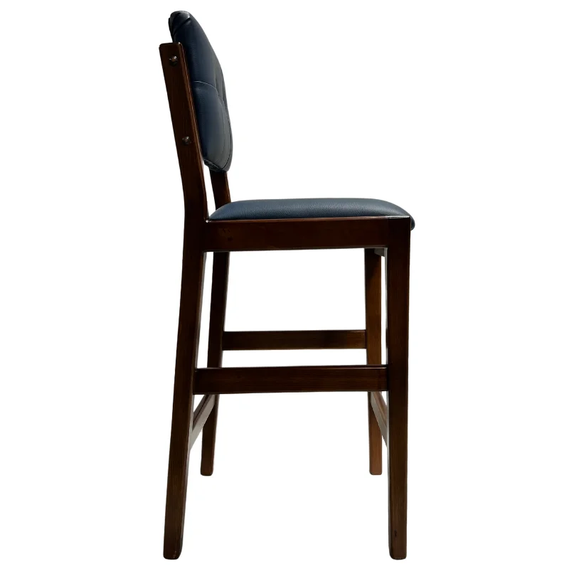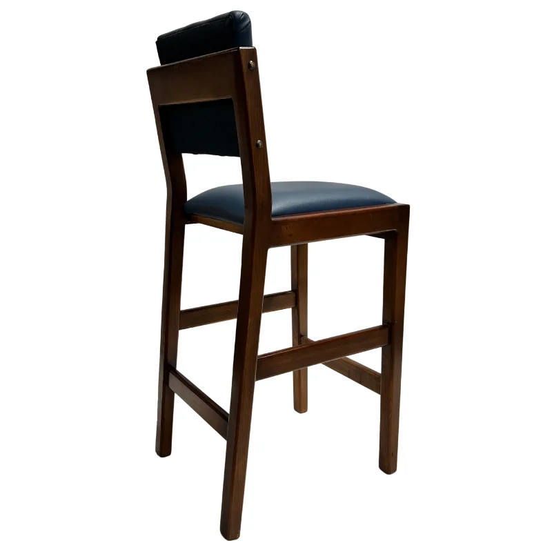 Esta elegante silla de bar, fabricada a mano en madera color almendra oscura, cuenta con un tapizado en vinil color azul marino, diseñada con un estilo moderno.