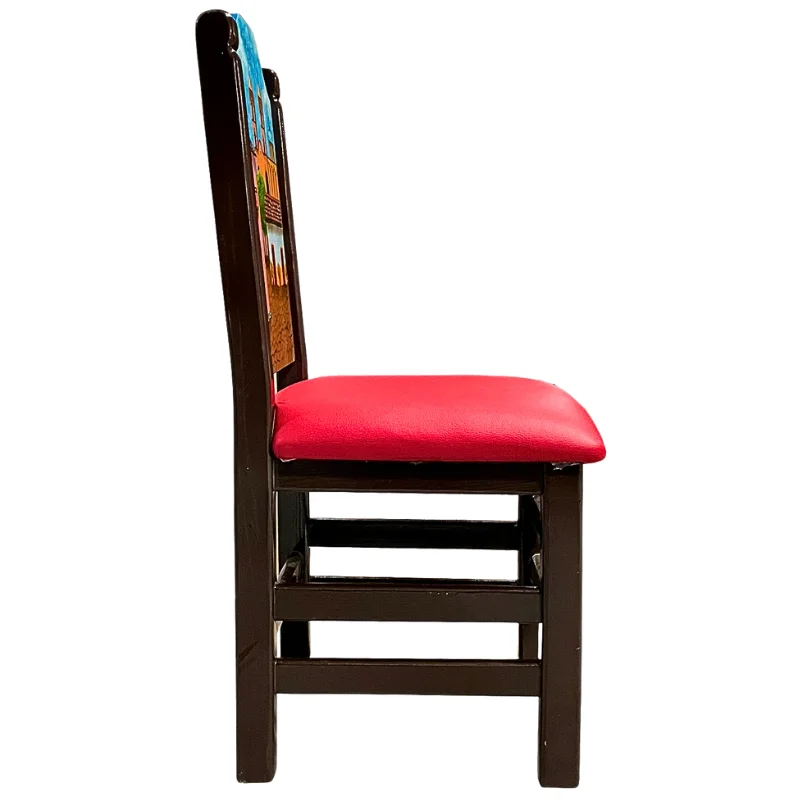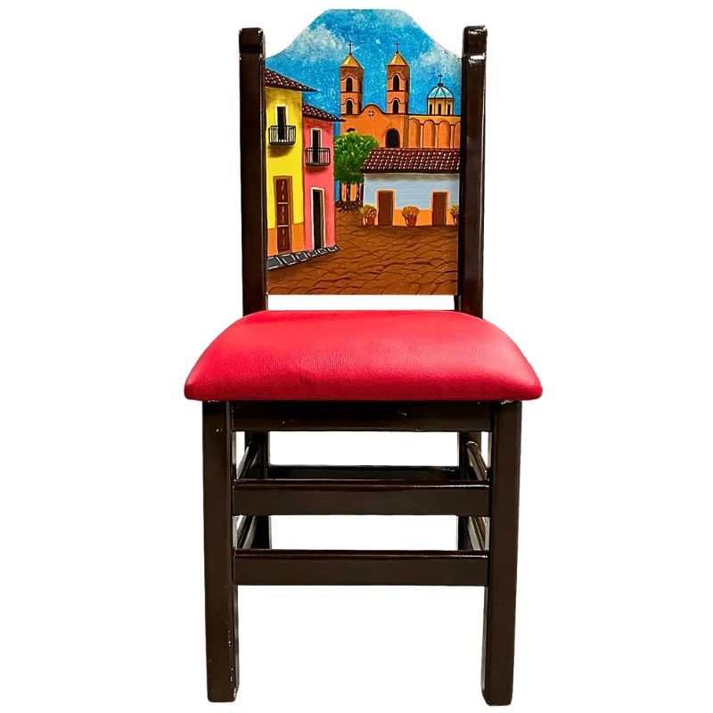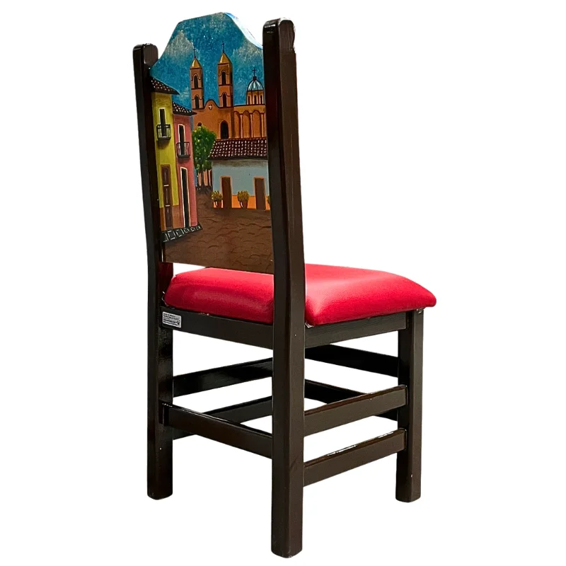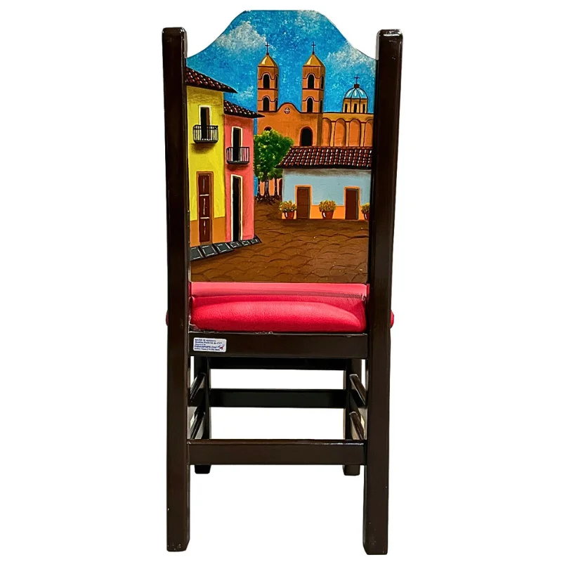 Silla pintada a mano de madera color chocolate, en el respaldo lleva pintura por ambos lado de la silla la imagen de un pueblo magico en Mexico.