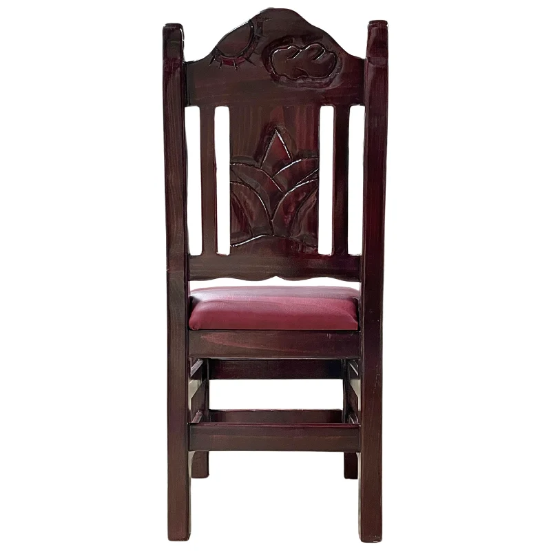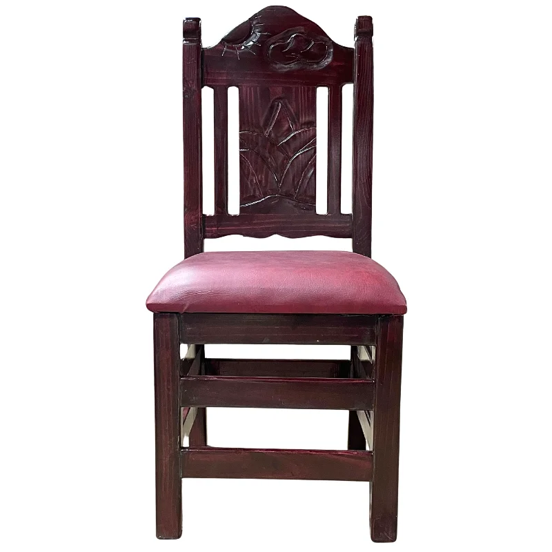 Silla rustica de madera de pino color almendra oscuro con barras horizontales en el respaldo, tiene asiento de vinyl en color burgandy.