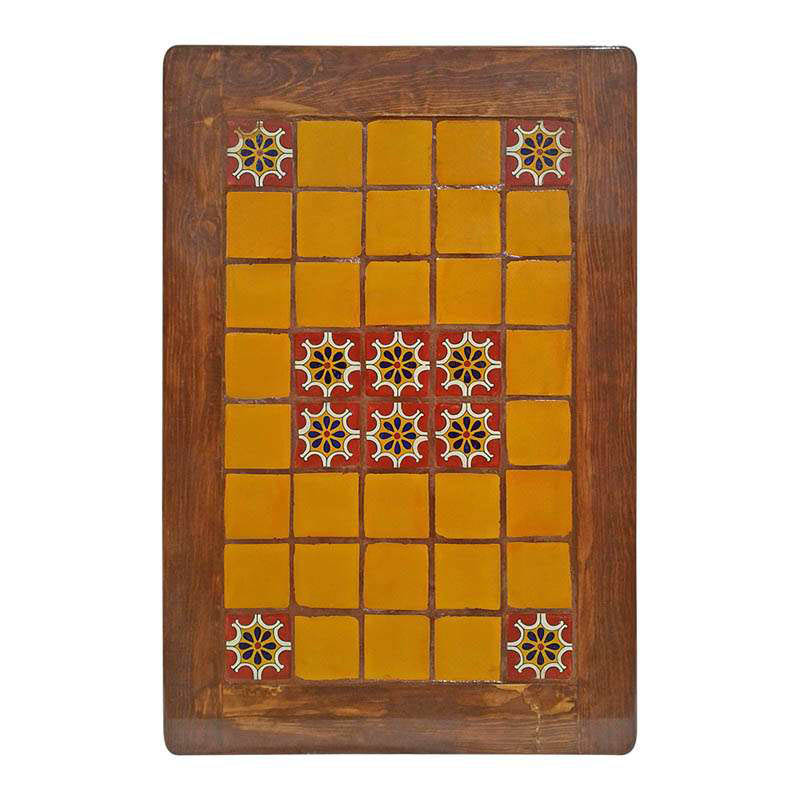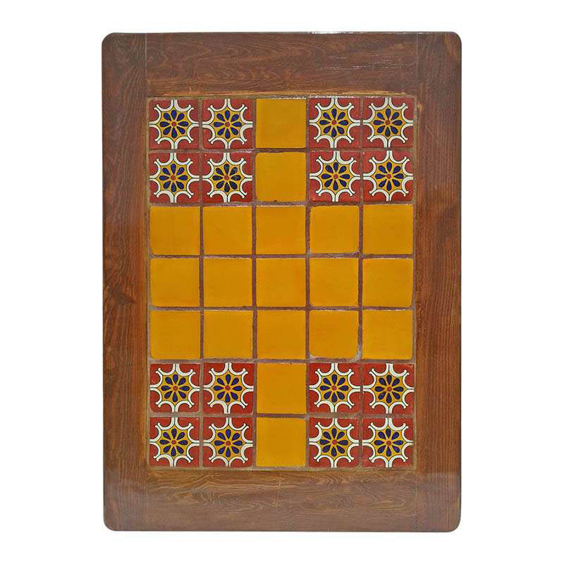 Tapa de mesa de madera color almendra con azulejos decorativos en el centro, presentando combinaciones de amarillo y rojo con diseños elegantes. Cada mesa cuenta con un grosor de ceja de aproximadamente 2.5" y está recubierta con resina industrial para mayor protección y durabilidad.