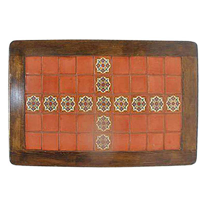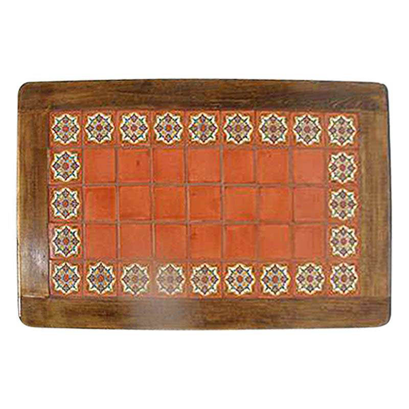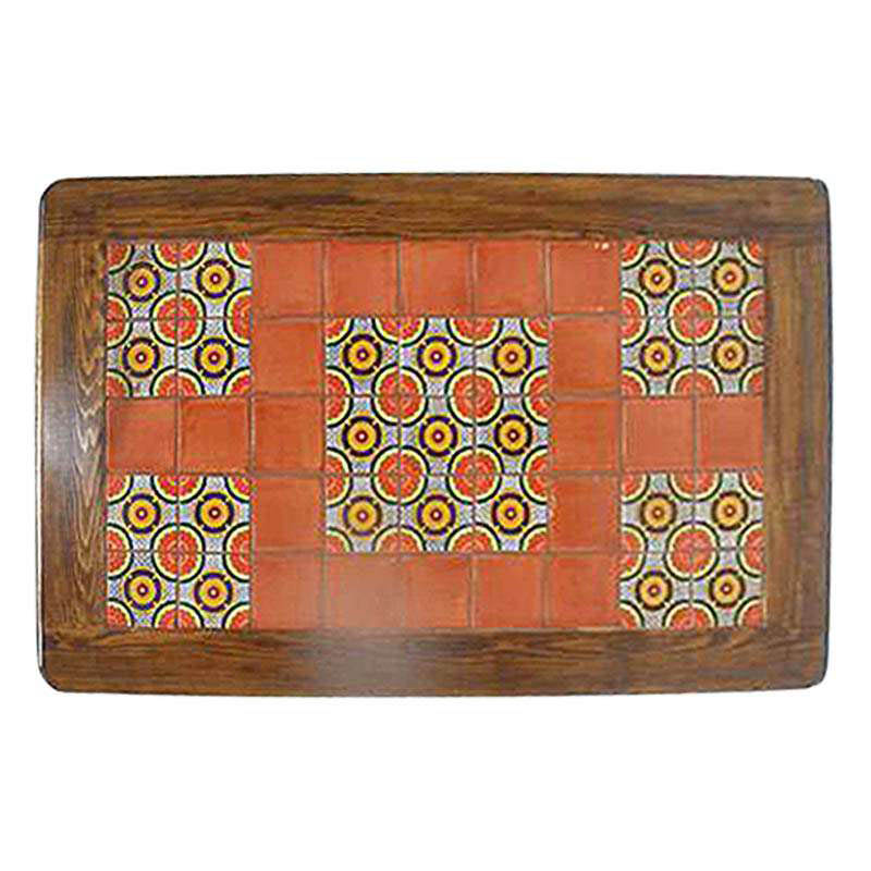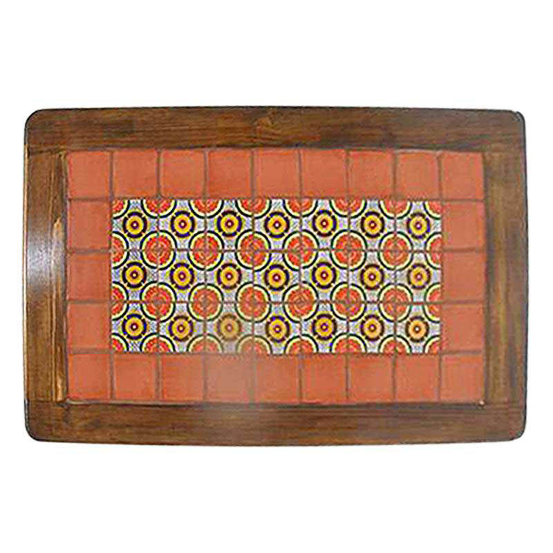 Tapa de mesa de madera color almendra con azulejos decorativos en el centro, presentando combinaciones naranja y diseños elegantes. Cada mesa cuenta con un grosor de ceja de aproximadamente 2.5" y está recubierta con resina industrial para mayor protección y durabilidad.