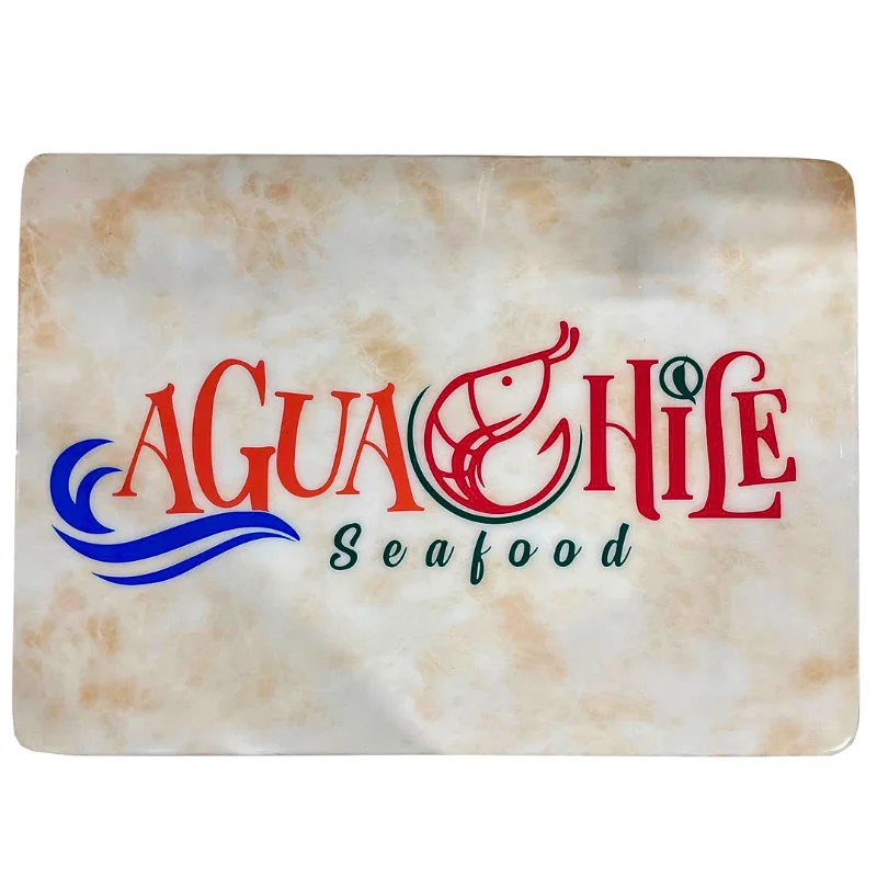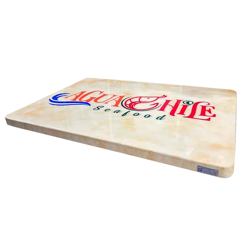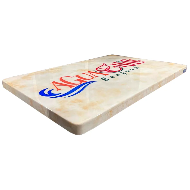 Tapa de mesa de madera con acabado tipo mármol y logotipo, diseñada para brindar la apariencia elegante del mármol sin sacrificar la calidez y resistencia de la madera. Su superficie cuenta con un acabado brillante y realista que imita las vetas del mármol, ideal para dar un toque sofisticado a su restaurante, café o bar.