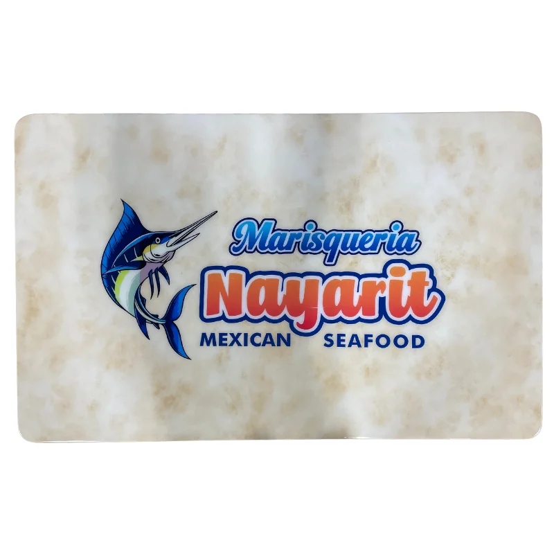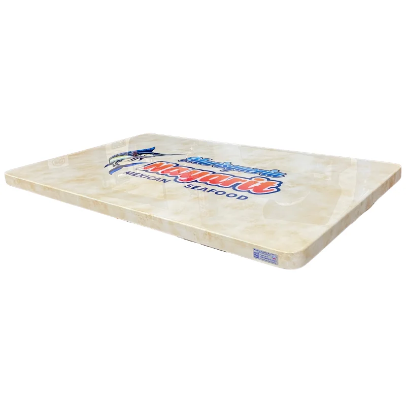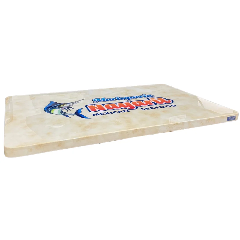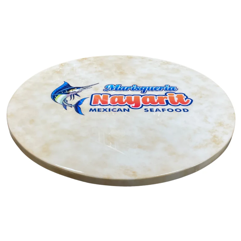 Tapa de mesa de madera con acabado tipo mármol y logotipo, diseñada para brindar la apariencia elegante del mármol sin sacrificar la calidez y resistencia de la madera. Su superficie cuenta con un acabado brillante y realista que imita las vetas del mármol, ideal para dar un toque sofisticado a su restaurante, café o bar.