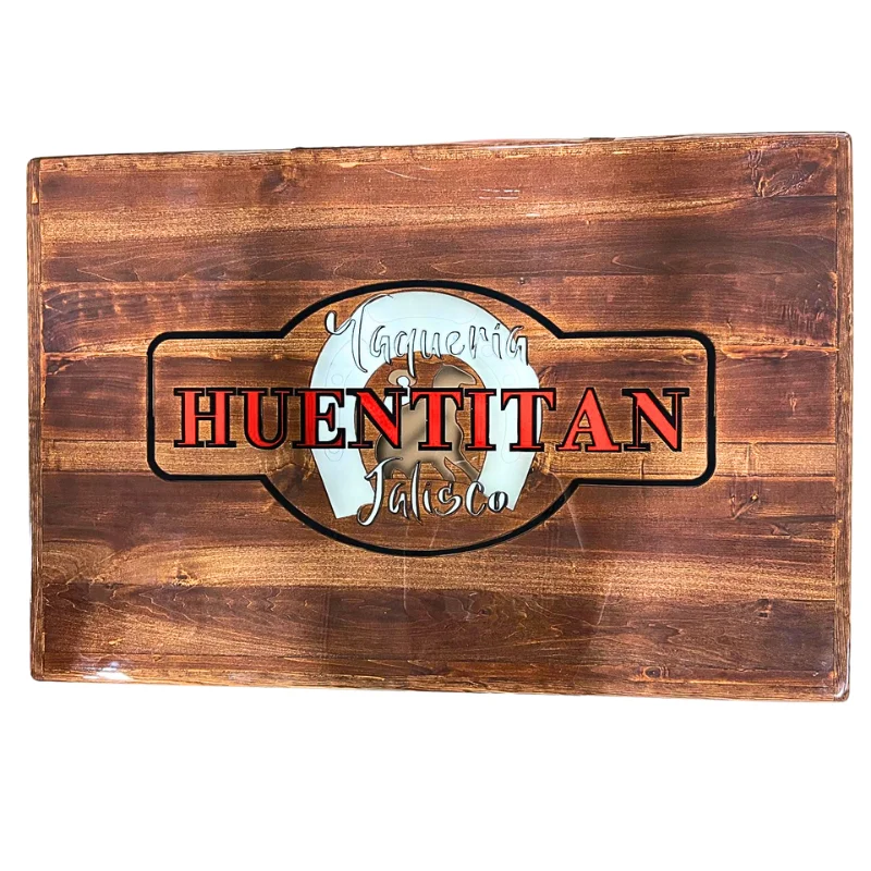 Tapa de mesa de madera con logotipo, diseñada para brindar la apariencia elegante sin sacrificar la calidez y resistencia de la madera. Su superficie cuenta con un acabado brillante ideal para dar un toque sofisticado a su restaurante, café o bar.