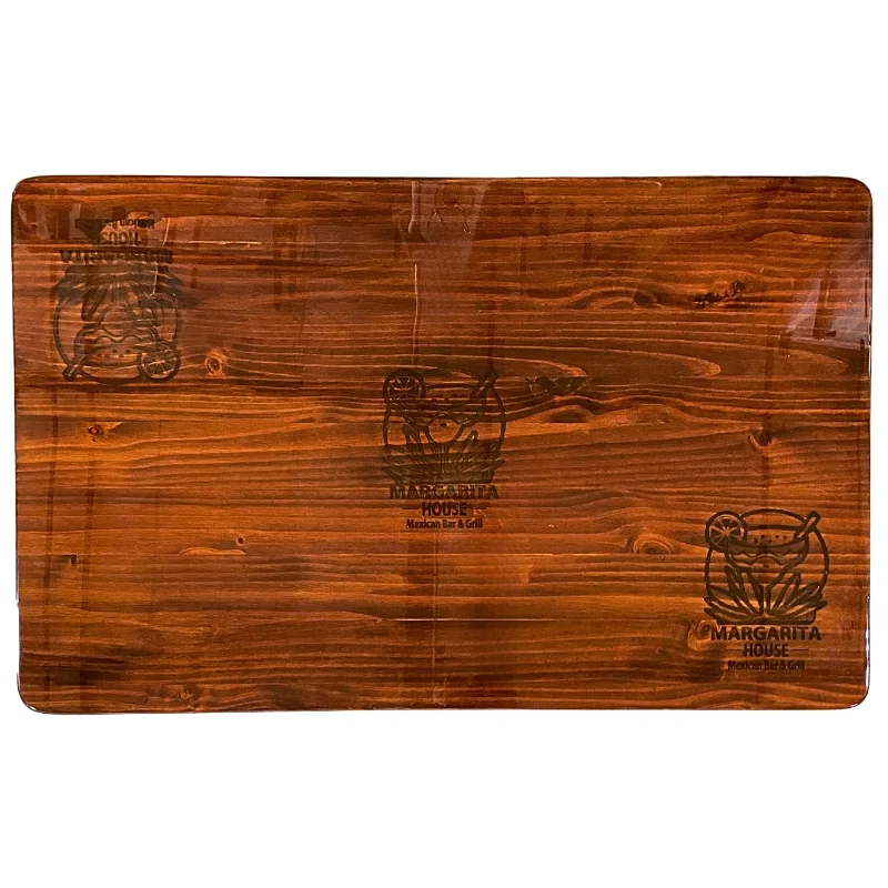 Tapa de mesa de madera con logotipo, diseñada para brindar la apariencia elegante sin sacrificar la calidez y resistencia de la madera. Su superficie cuenta con un acabado brillante ideal para dar un toque sofisticado a su restaurante, café o bar.