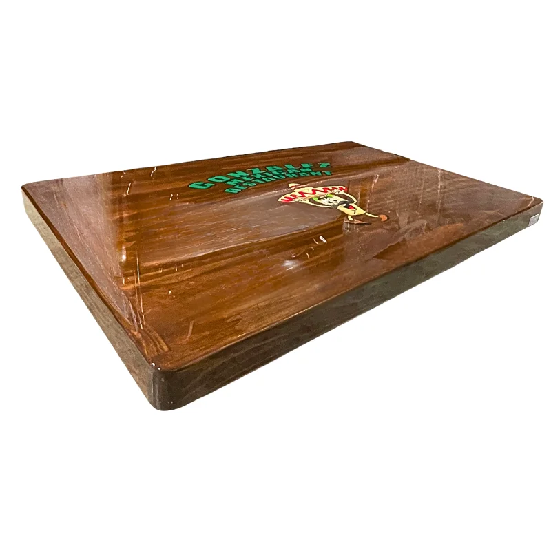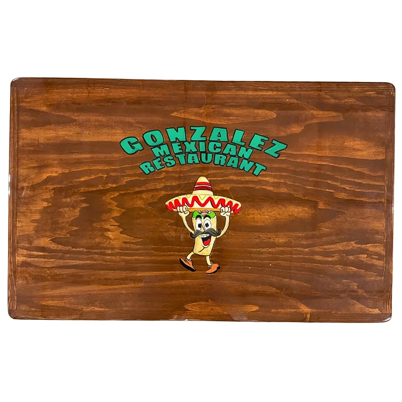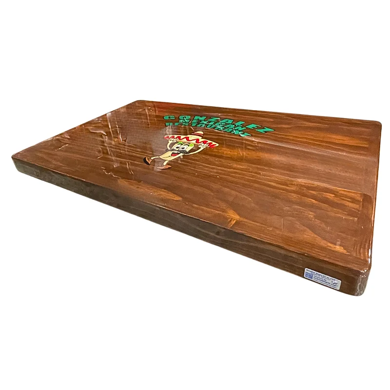 Tapa de mesa de madera con logotipo, diseñada para brindar la apariencia elegante sin sacrificar la calidez y resistencia de la madera. Su superficie cuenta con un acabado brillante ideal para dar un toque sofisticado a su restaurante, café o bar.