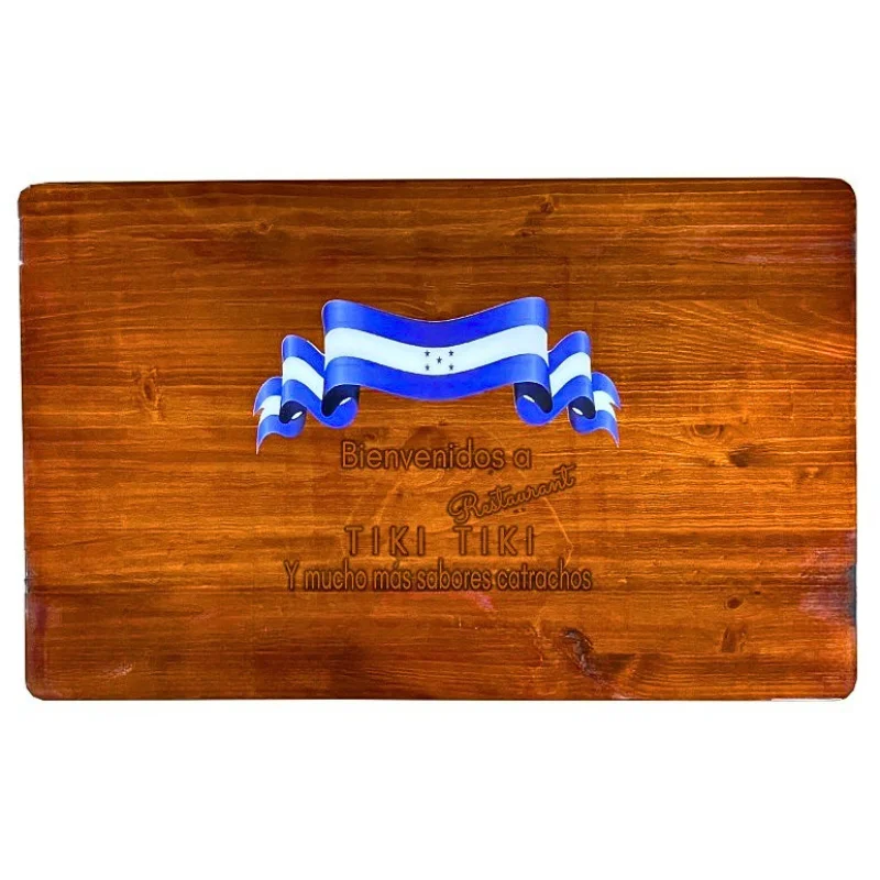 Tapa de mesa de madera con logotipo, diseñada para brindar la apariencia elegante sin sacrificar la calidez y resistencia de la madera. Su superficie cuenta con un acabado brillante ideal para dar un toque sofisticado a su restaurante, café o bar.