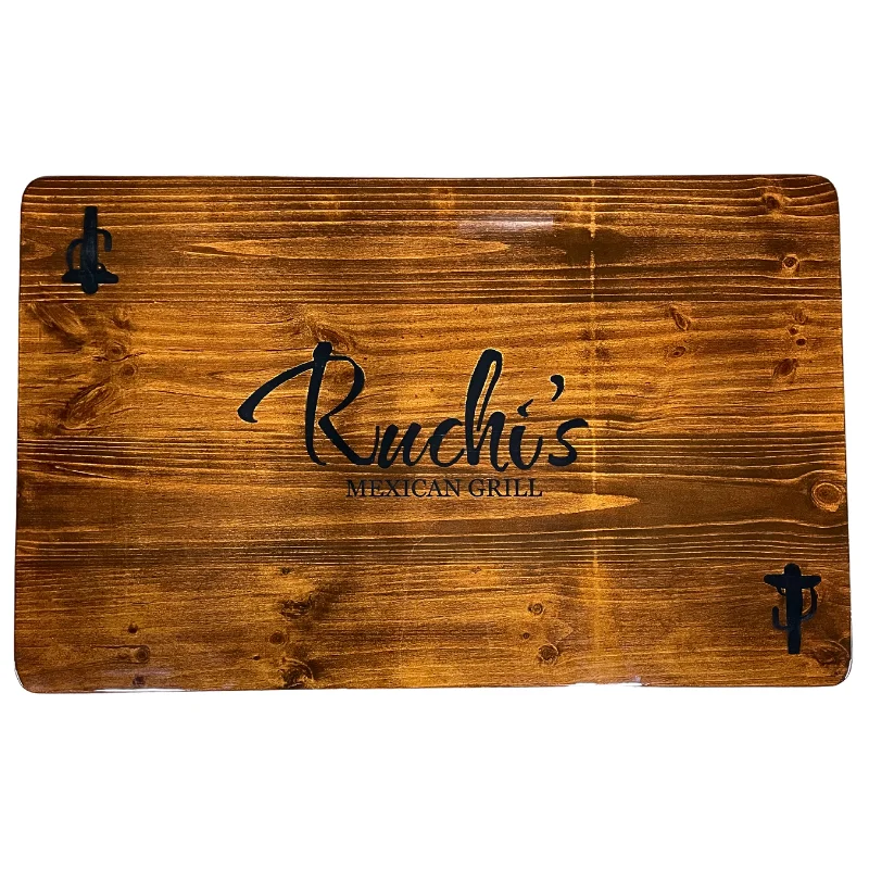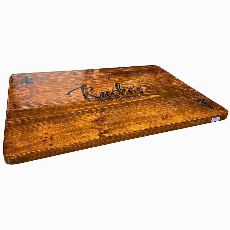 Tapa de mesa de madera con logotipo, diseñada para brindar la apariencia elegante sin sacrificar la calidez y resistencia de la madera. Su superficie cuenta con un acabado brillante ideal para dar un toque sofisticado a su restaurante, café o bar.